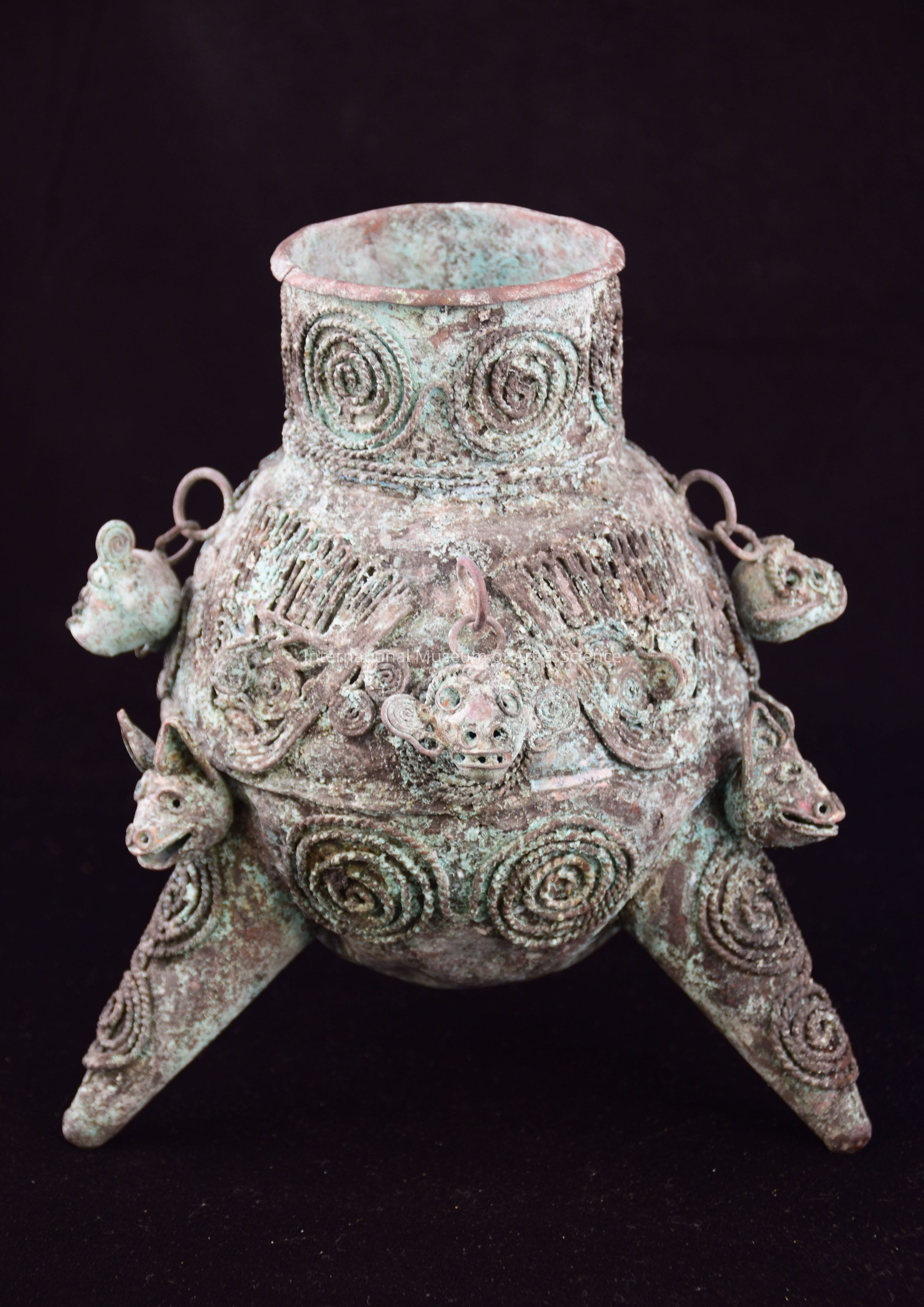 A tripod pot. The pot has a globular shaped body, with three long conical legs. It has a short neck and a flat rim. There are four copper monkey heads attached to the exterior, and three copper coyote heads, one attached above each leg. There are wire facial decorations on the exterior and coiled spiral designs.Made/Created