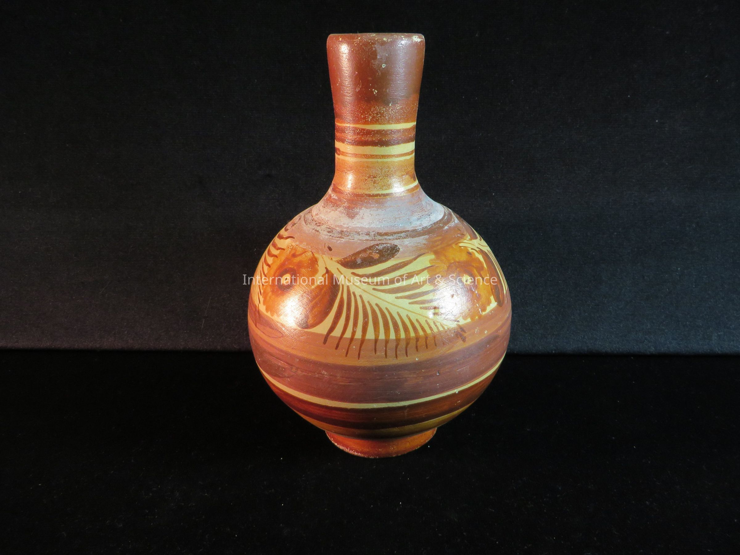 A ceramic vase with a large belly, and a thin neck. The piece is decorated with horizonal stripes and flowers. The colors are red, orange, brown, and yellow.Ethnography