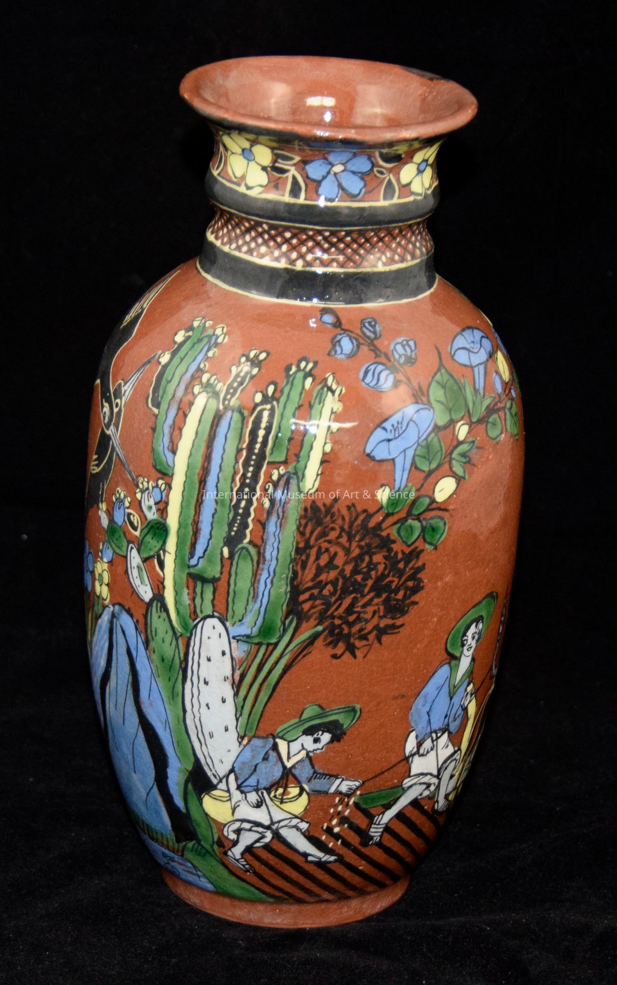 Vase. A vase with bark brown background; blue and yellow flowers on neck; depict two labor workers plowing and planting seeds; blue house, rocks, by ponds with three ducks, green cactus plants, and trees; black birds, grey trees; deer and horses.Made/Created