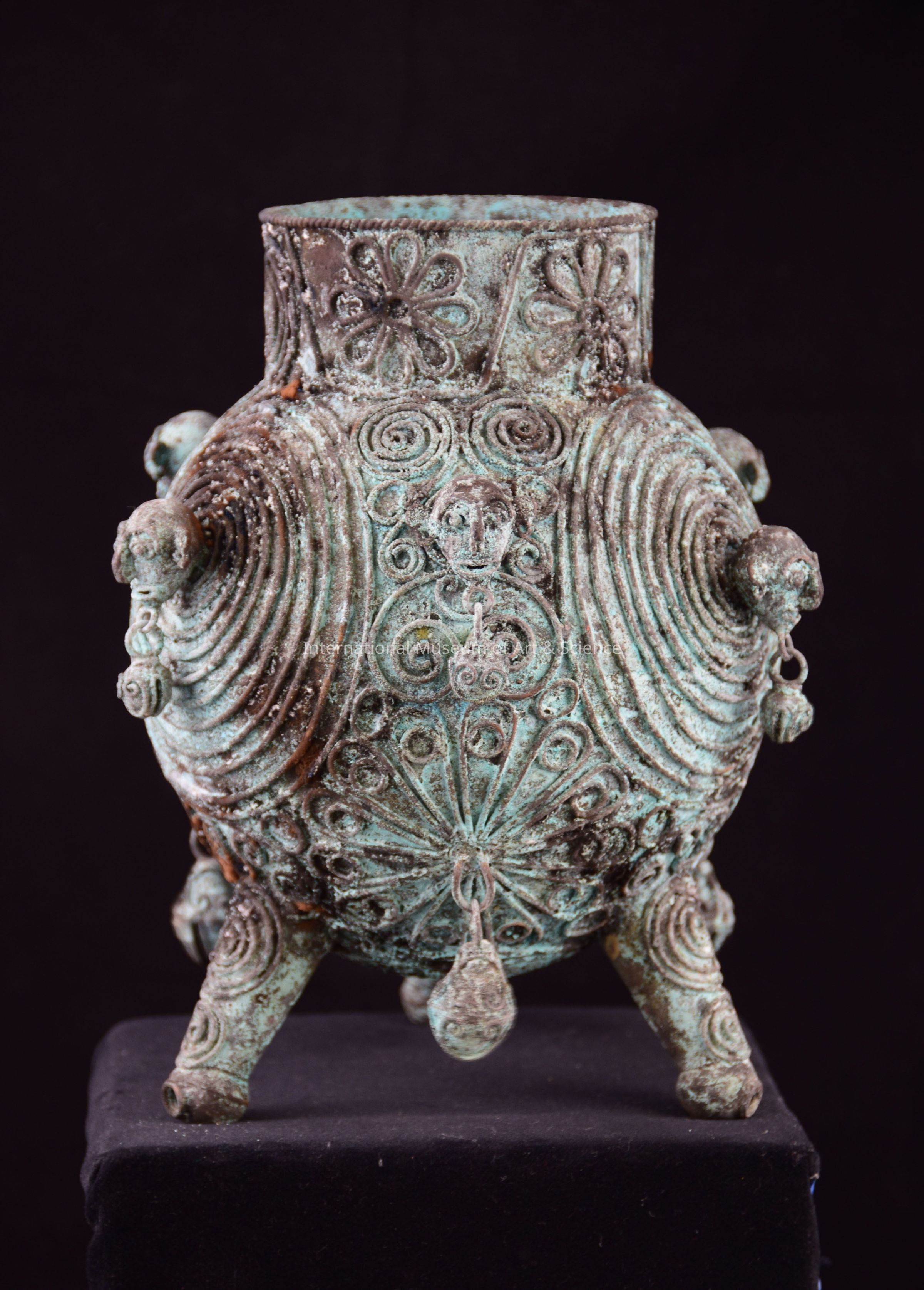 A tripod pot. the pot has a globular shaped body, with three long conical legs. There are six copper monkey heads around exterior with bells attached to their chin. Along with the monkeys, there are wire appligue decorations in large coiled and floral patterns decorating the exterior. There are three copper bells suspended from the bottom section of the tripod pot, in the shape of snake heads. The pot has a short flat rim.Made/Created