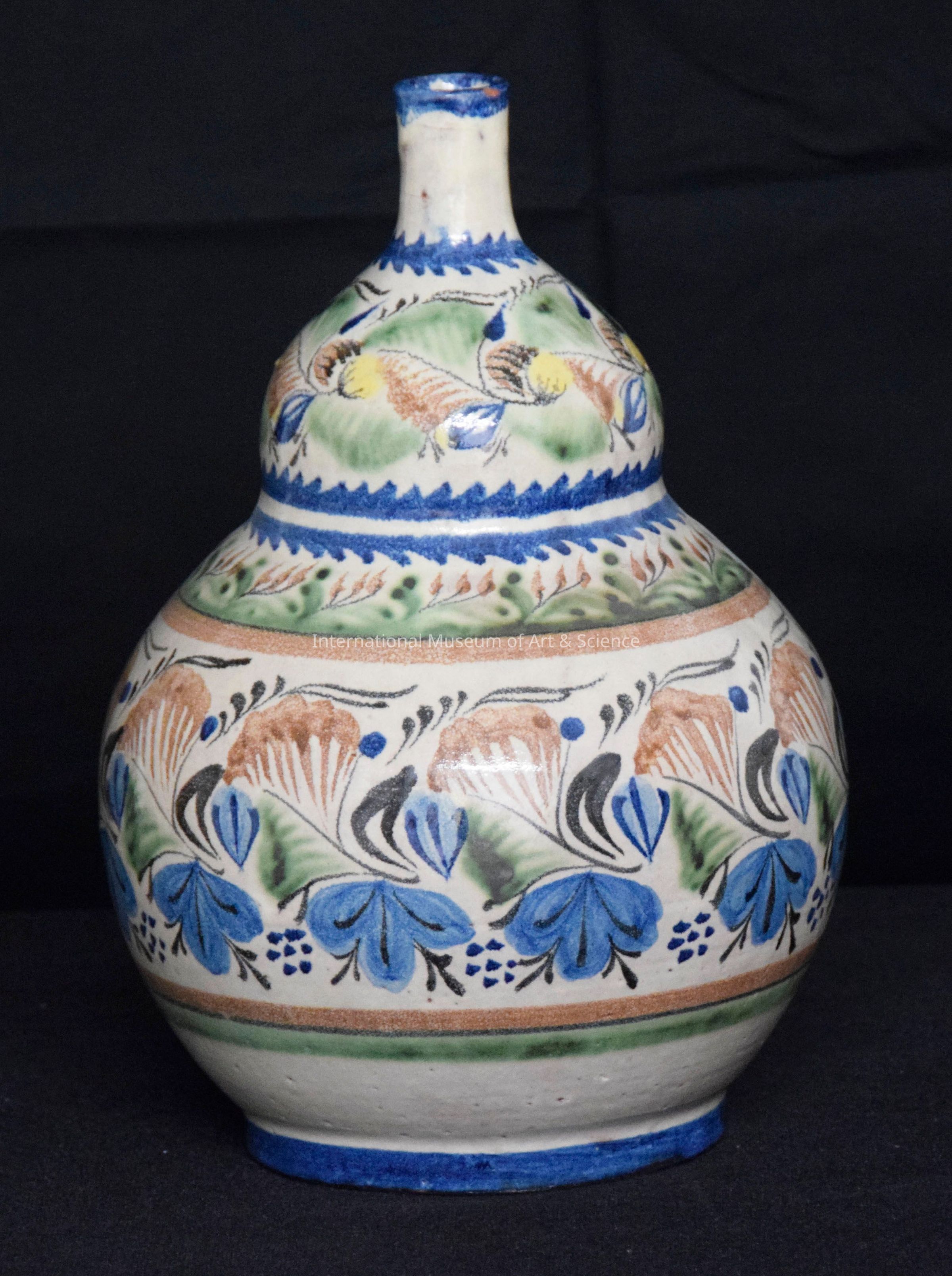 Narrow spout at top with blue border; double-shaped; large global body; cream background; vessel fully decorated with floral motifs of blue, green, brown, yellow and black.Dimensions