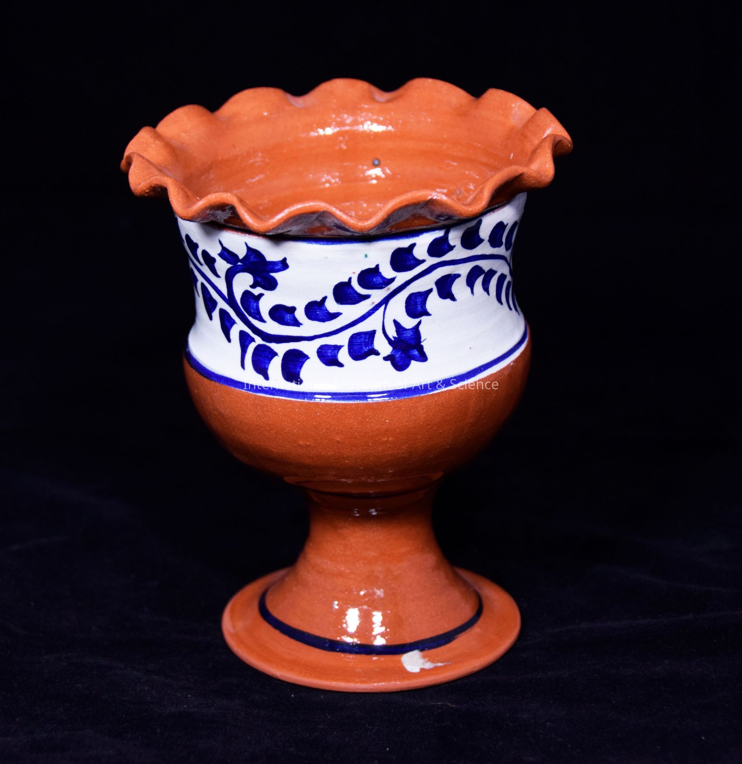 Pedestal vessel; fluted mouth; wide band painted white with blue designs; small drain hole inside center vessel.