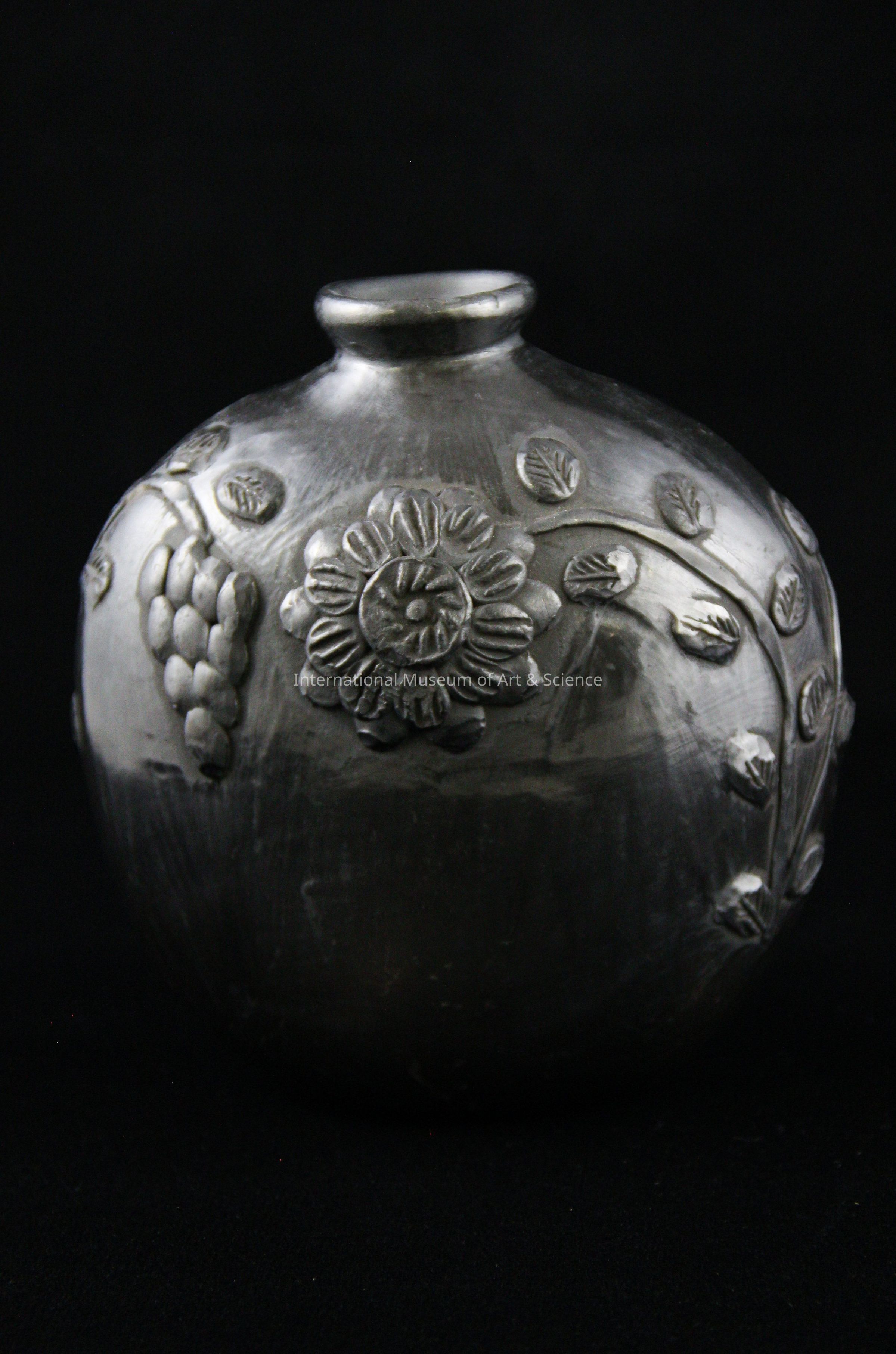 A black clay ceramic vase. The vase has a spherical-shaped body, a small mouth on top, and an oval base. It is decorated with applied flowers in relief (pastillaje technique).Made/Created