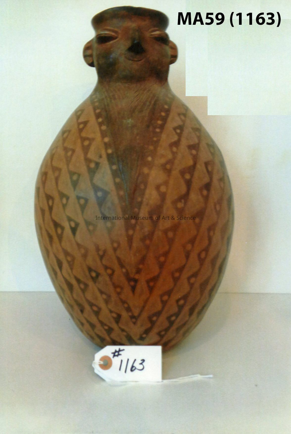A ceramic ceremonial vase. A man's face protrudes from the neck of the vessel. The face has a small beak nose, quinting eyes, a small smile, and ears on the sides. The body of the vase is decorated with triangle, line, and dot designs in dark and light brown hues. The vase possible is a "Birdman" pot.Dimensions
