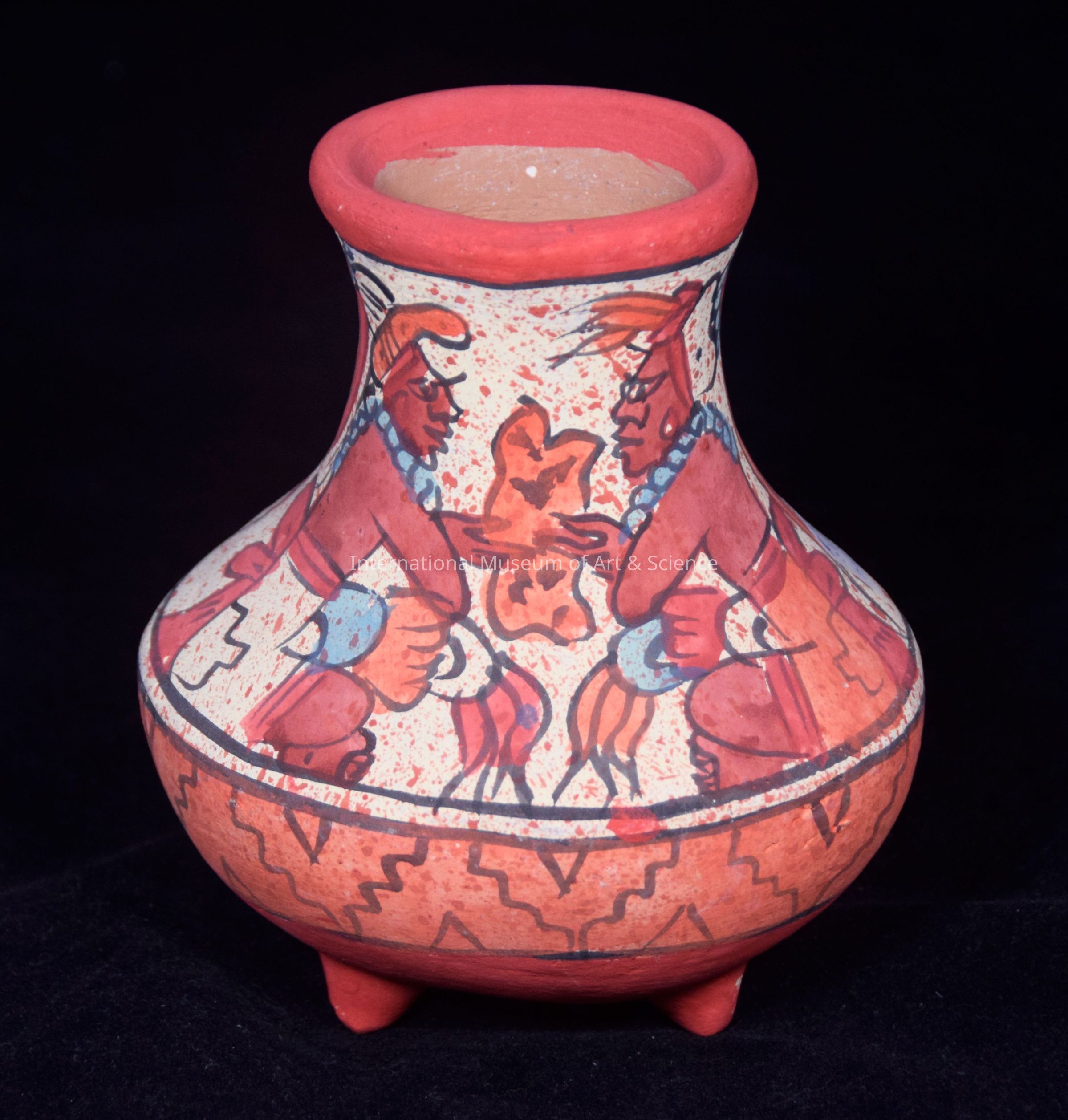 Tripod Vase. Tripod vase made of clay, three short feet, spherical body, short neck, round mouth; mouth rim painted red-orange neck and body painted with three seated Maya figures painted with dark brown skin color; blue beaded necklace; cream background.Dimensions