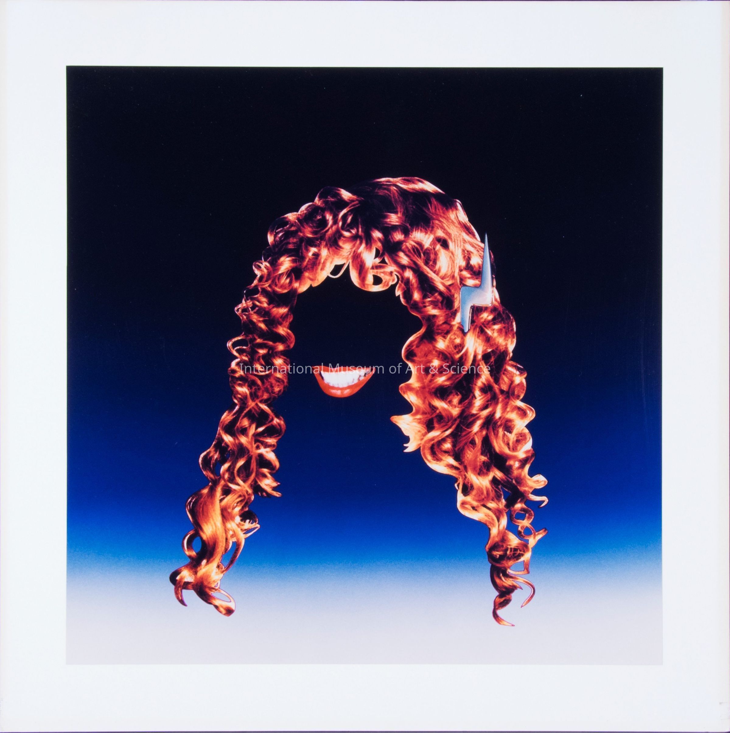"Veena Aspara". Mansfield, American. Photograph. Unknown Date. Red curls, no face, smile & chrome antenna in shape of lightning bolt, blue background; mounted on white paper and masonite.Artwork Details