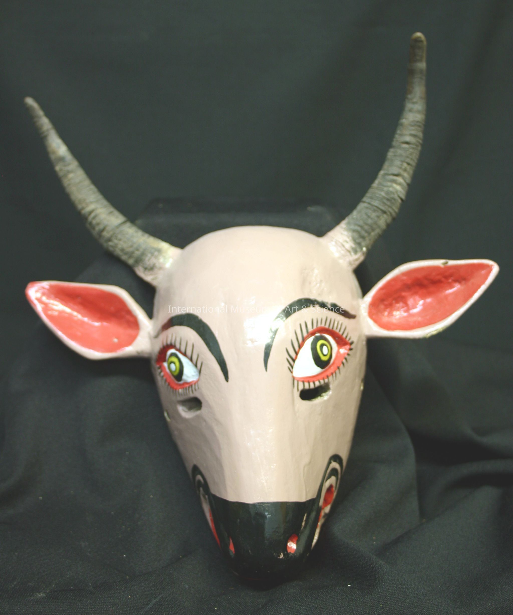 A Venado (Deer) mask. The face is painted a medium grey color, it has black curved eyebrows, a black nose, a red tongue and mouth, and two carved holes inside mouth. It has projected oval ears with the interior painted red. the oval eyes are painted white and black with yellow outlined in red, and black eyelashes. There are slits under the eyes for the wearer to see through. The horns are attached with a glue and soil mixture.Artwork Details