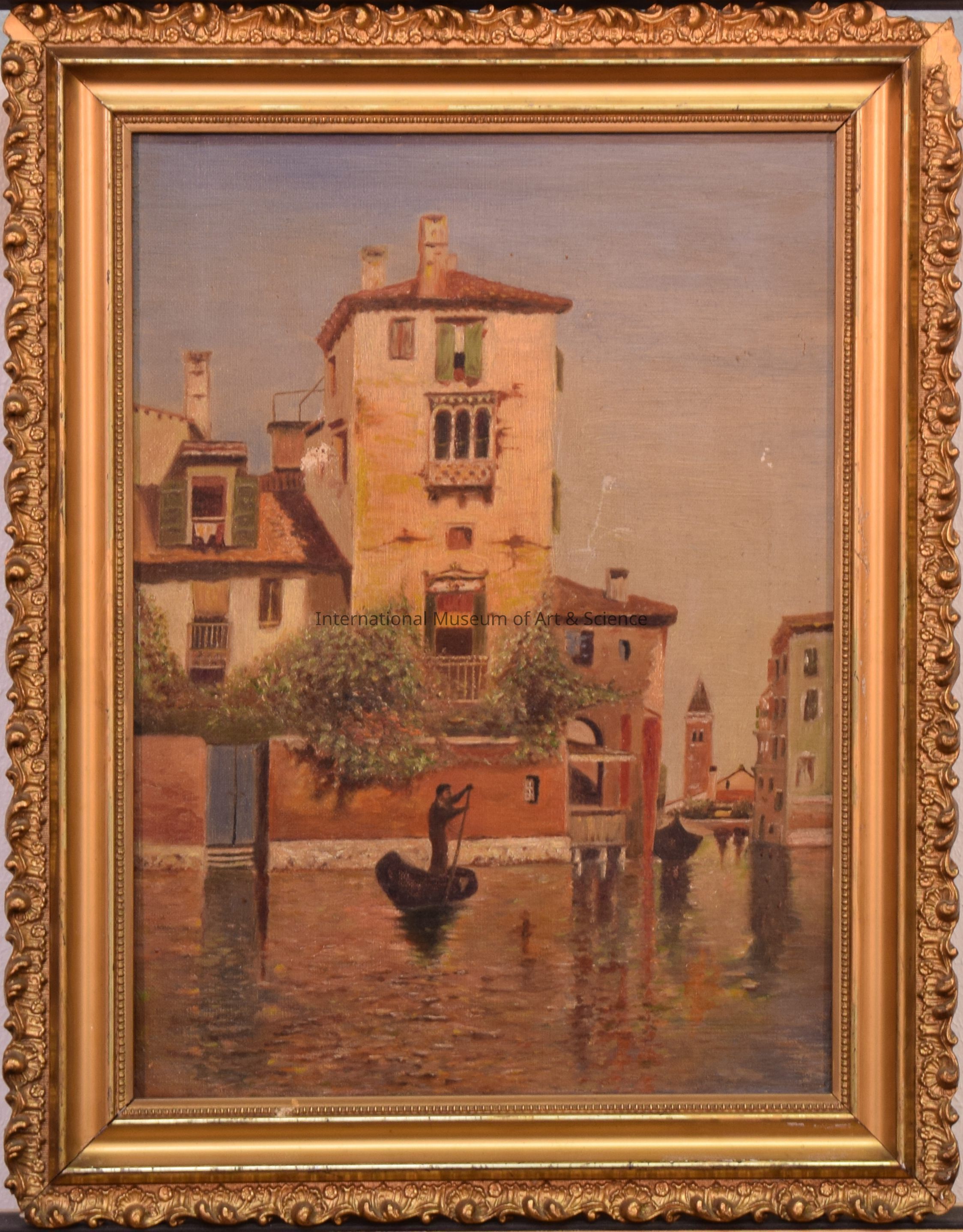"Venice." Harry Sherman. Unknown date. Oil on canvas. Venice landscape depicting canals between buildings and a man in a boat. Muted tans, redp-brown, gray blue sky. Back has birth and death date (1868-1957) and name of artist.Artwork Details
