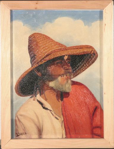 Colored painting of man with a hat.Made/Created