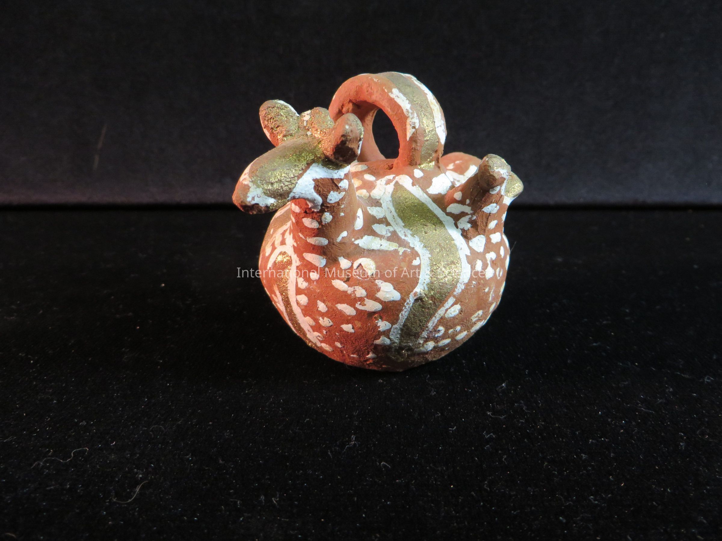 Tangayu (zoomorphic vessel). Brown clay with white and gold paint. Animal head and two birds, with spout. Handle at top of vessel, white dot pattern, with strips of gold painted on and outlined in white. Source of Acquisition: Victor Artes Regionales.Made/Created