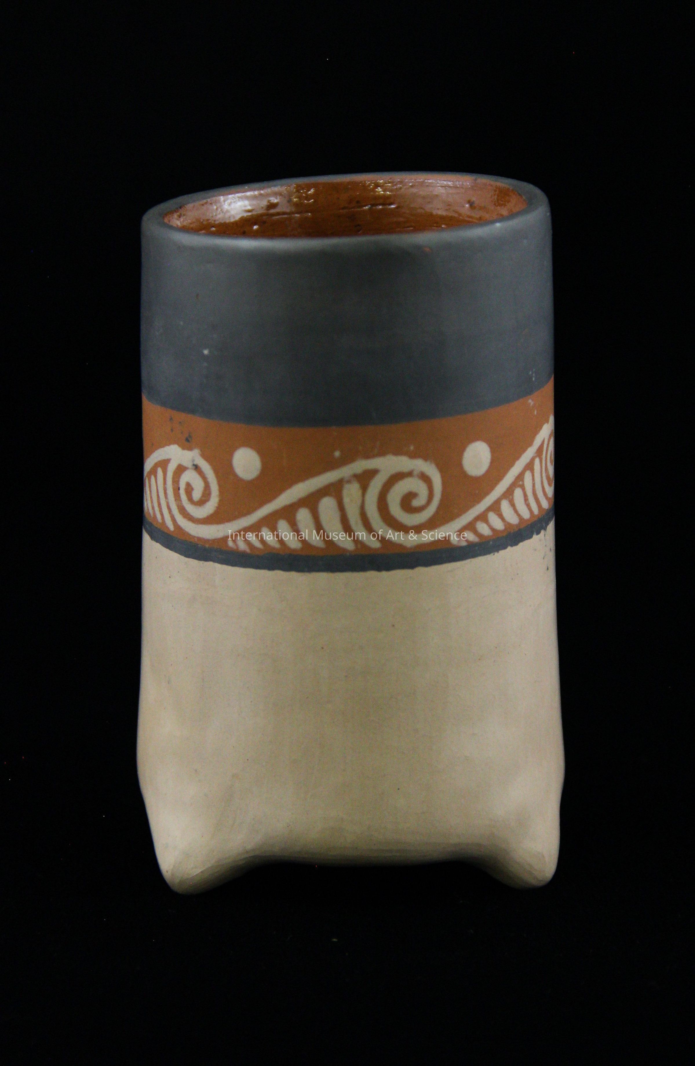 A ceramic vessel, or cup. The top half of the exterior is painted black, then there is a brown and cream wave and dot design, followed by a small black line. The bottom half of the vessel is a light cream color. The vessel stands on three small feet. The inside of the vessel has a glossy glazed finish.Made/Created