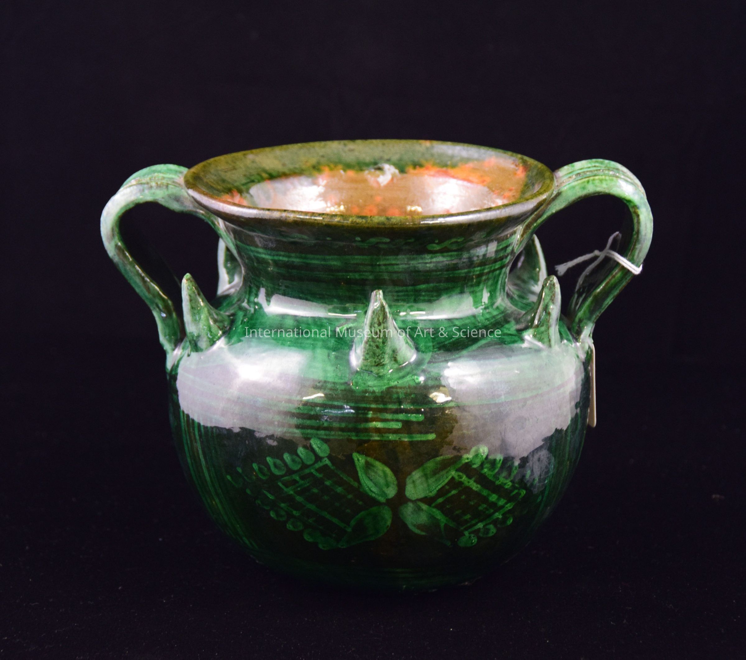 Clay, green-glazed vase with handles, decorated with six protruding spikes and painted floral motifs on both sides.Artwork Details