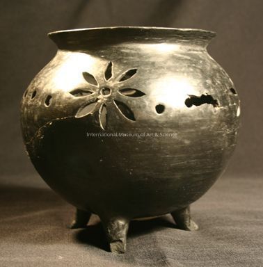 A black clay, ceramic tripod vessel. The vessel has a floral design cut into its side.