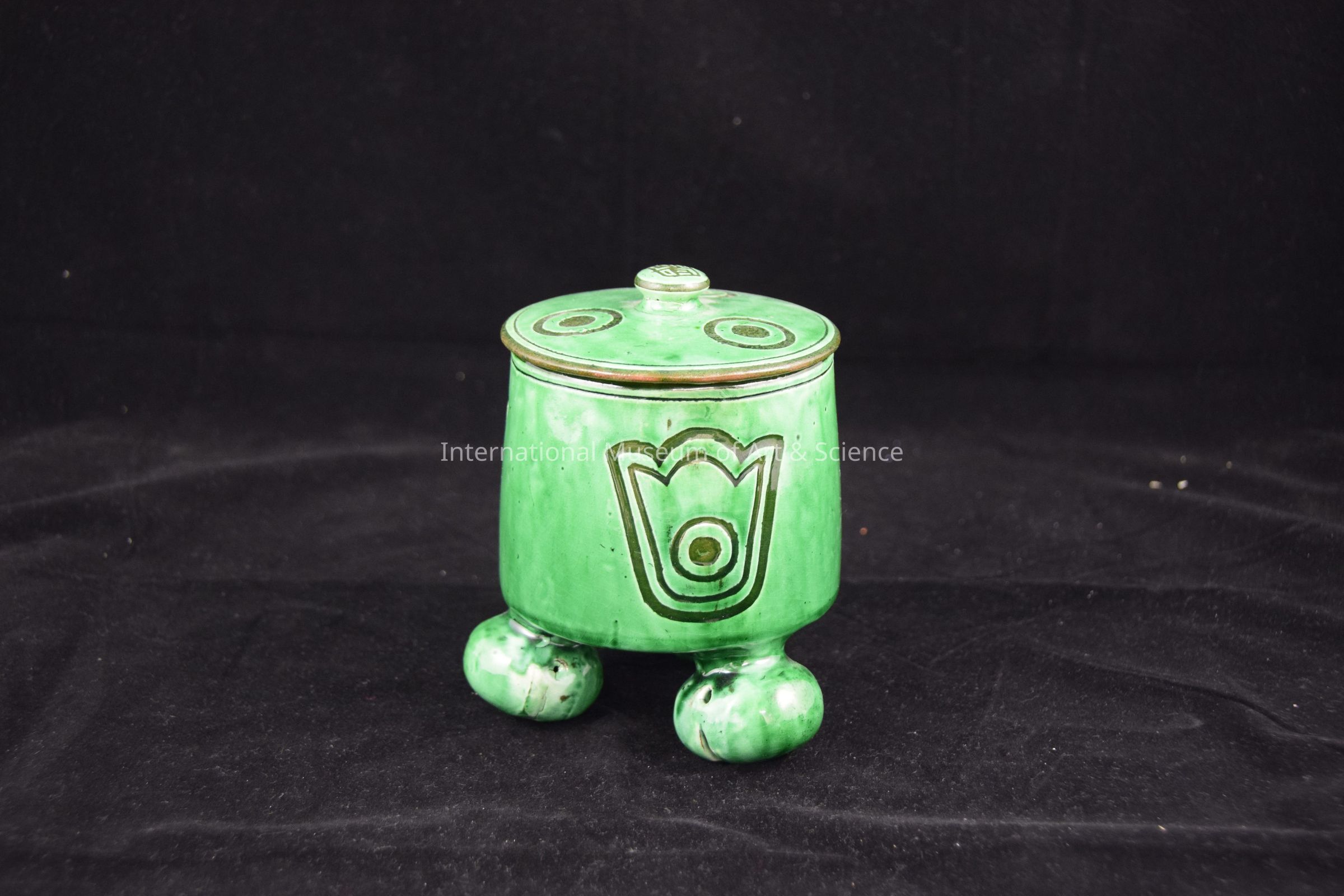 Lidded Container. Tripod base formed by 3 spherical feet with open groove cut in bottoms, clay pellets visible within (intended to be bells); Monte alban pattern incised, painted darker green - simple geometric shapes.Artwork Details