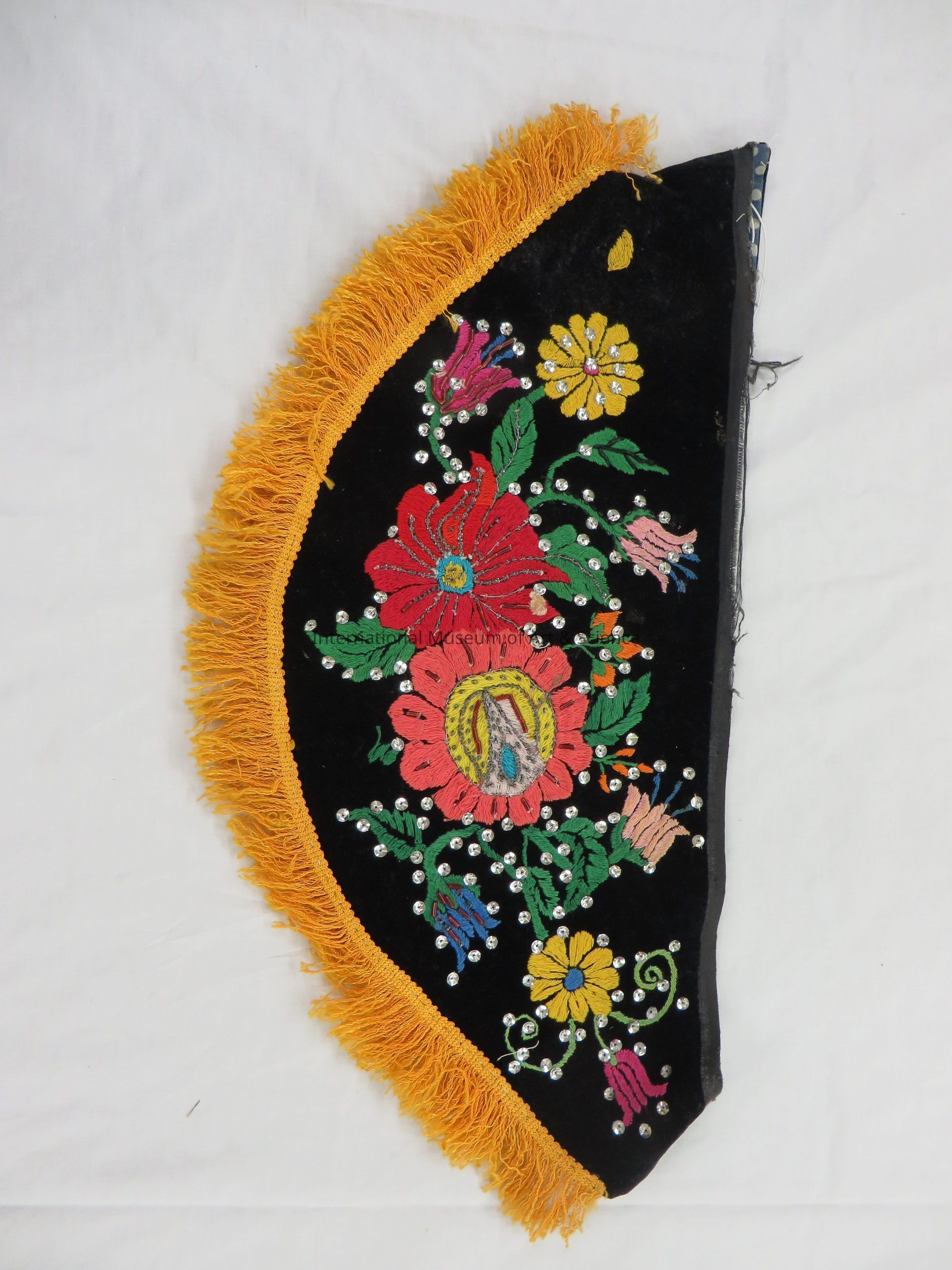 Vest. Papantla, Veracruz. Totonac Indian. Velvet fringe, cotton embroidery threads, sequins. c1984. Formed by semicircular "bandanas", two sets joined by stiching at one end. bLack velvet with bright flowers, birds greeneery embroidered over much of surface. Sequins and beads sewn on around flowers. Gold fringe sewn along outer curved edge of all four pieces, up to 3"-4" from end. One piece unlined, the other lined with blue/ white polka dotted polyester. Dusty.