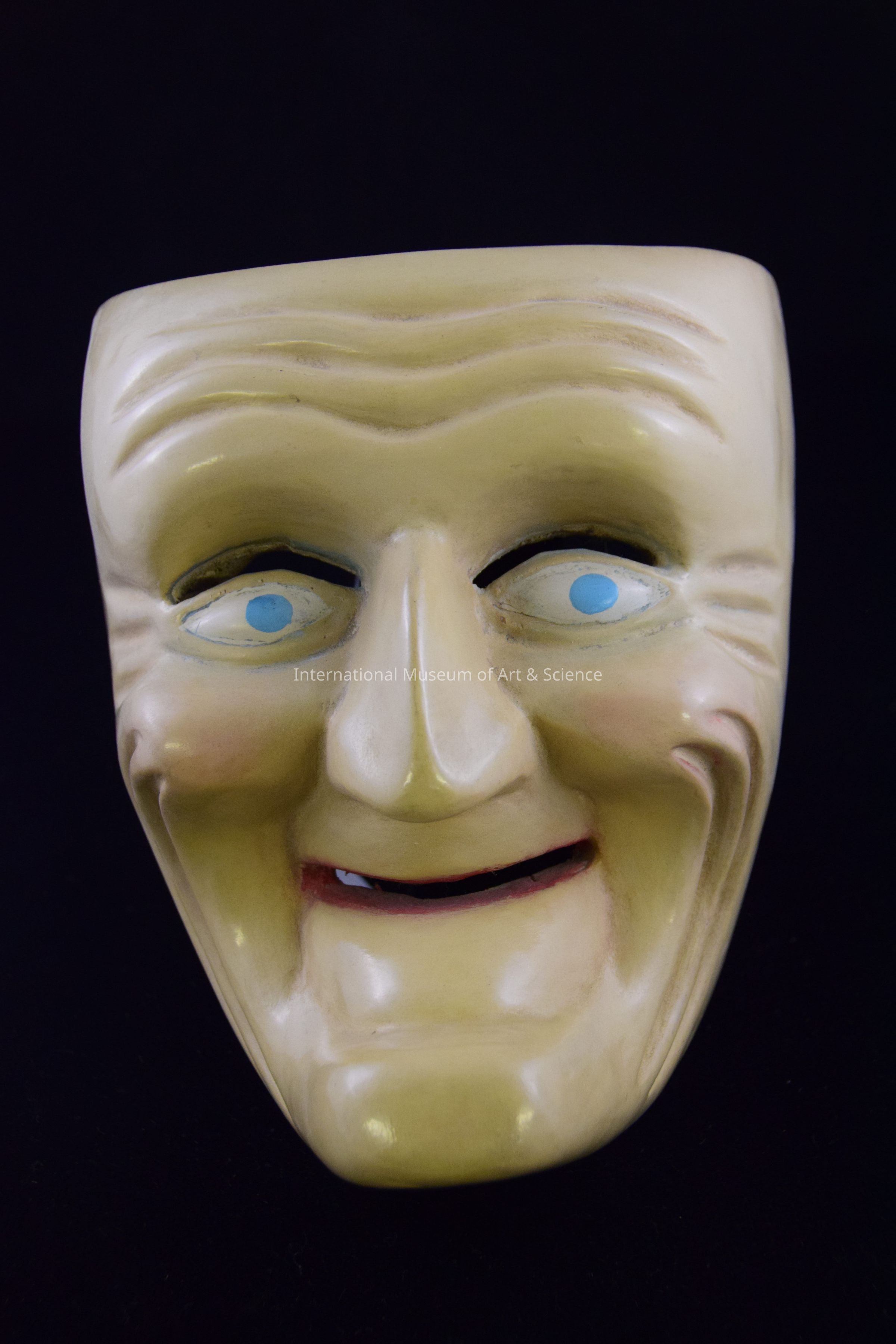 A wood carved mask. The mask depicts an old man's face or a Viejito. The face is painted a greyish skin tone. The face has blue eyes, a wide hooked nose, an pointed chin, and an open mouth. There are wrinkles carved into the mask on the forehead, near the eyes, and around the mouth.Dimensions