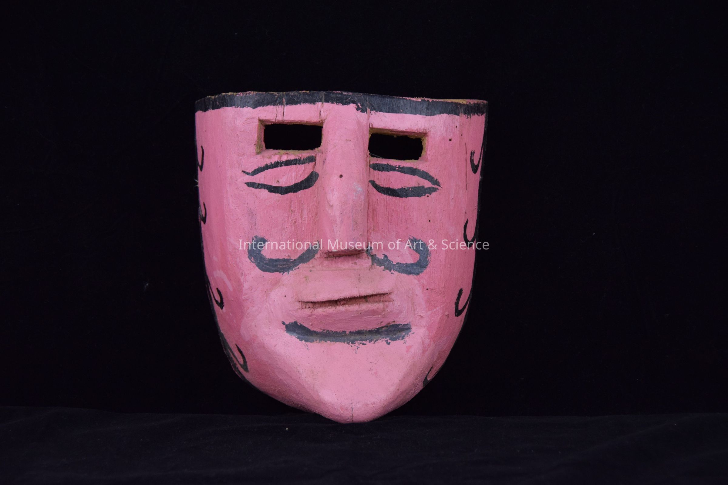 Overall pink mask; black split curls; black painted moustache and eyes; rectangular cut eye openings; protruded chin.Made/Created