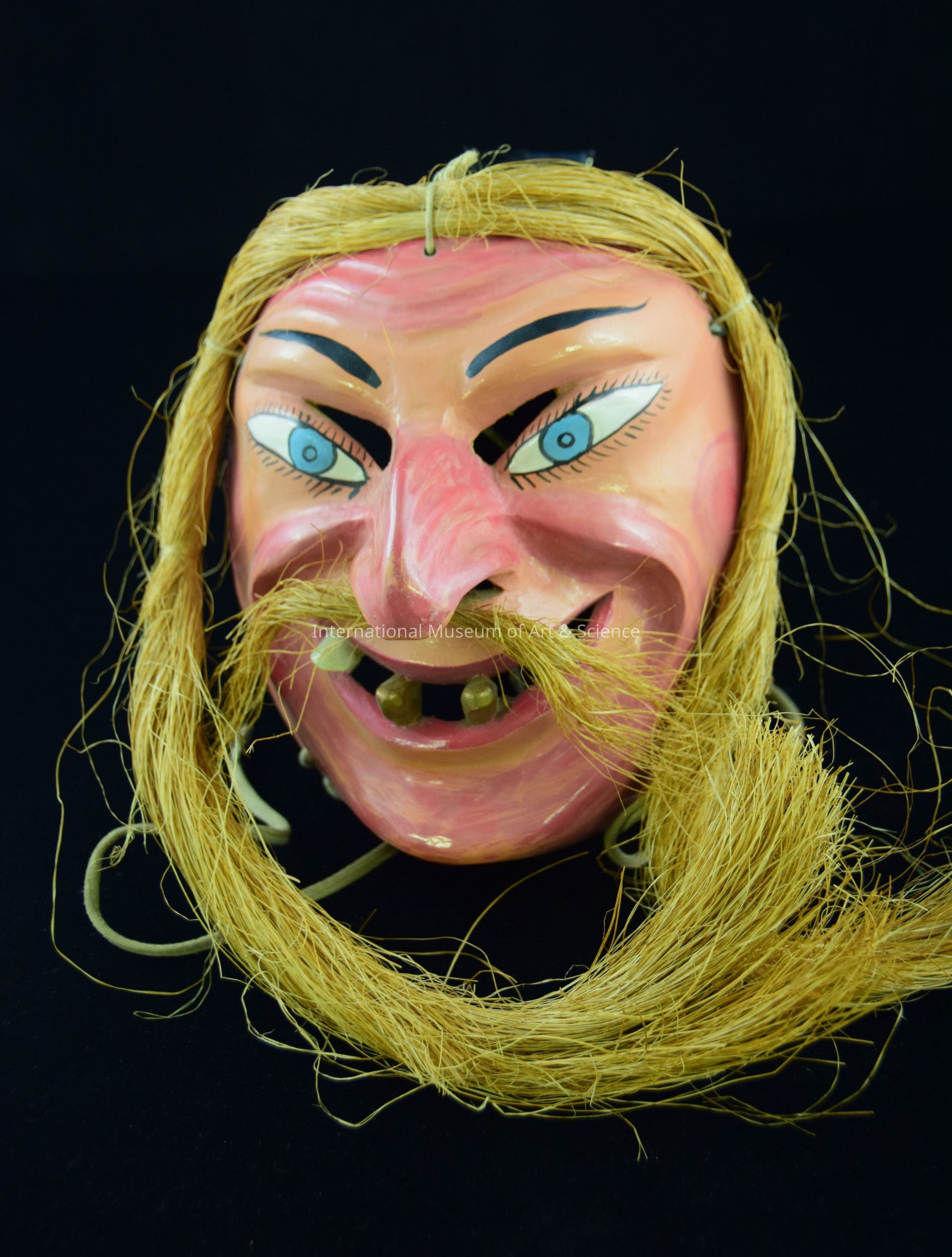 A wood carved mask. The mask depicts an old man's face or a Viejito. The face is painted in a flesh tone with rosy cheeks. The mask has a large hooked nose with a large and wide open mouth, showing off gold teeth. the face has blue eyes, and wrinkles on the forehead. Strands of hay have been used to create both a hair line and a moustache on the ask.Artwork Details