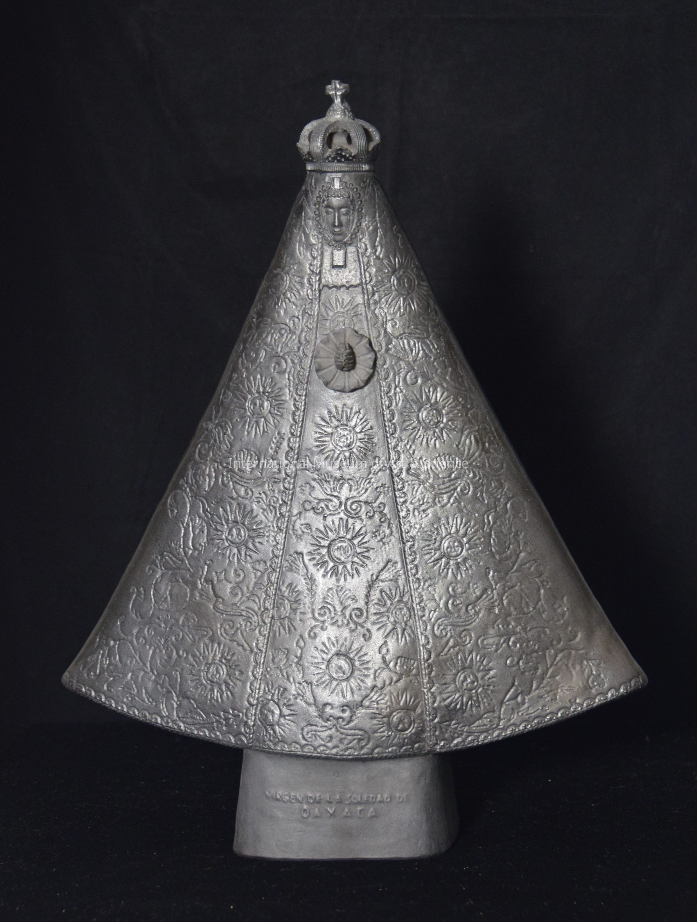 "Virgen de Soledad". The figure is wearing an open-designed crown with a small cross on top. She has a long cape with floral designs, her hands are together in front holding a flower. Her face is carved with a scalloped border. The figure stands on a black-burnish square base. Mold and slab construction.Dimensions