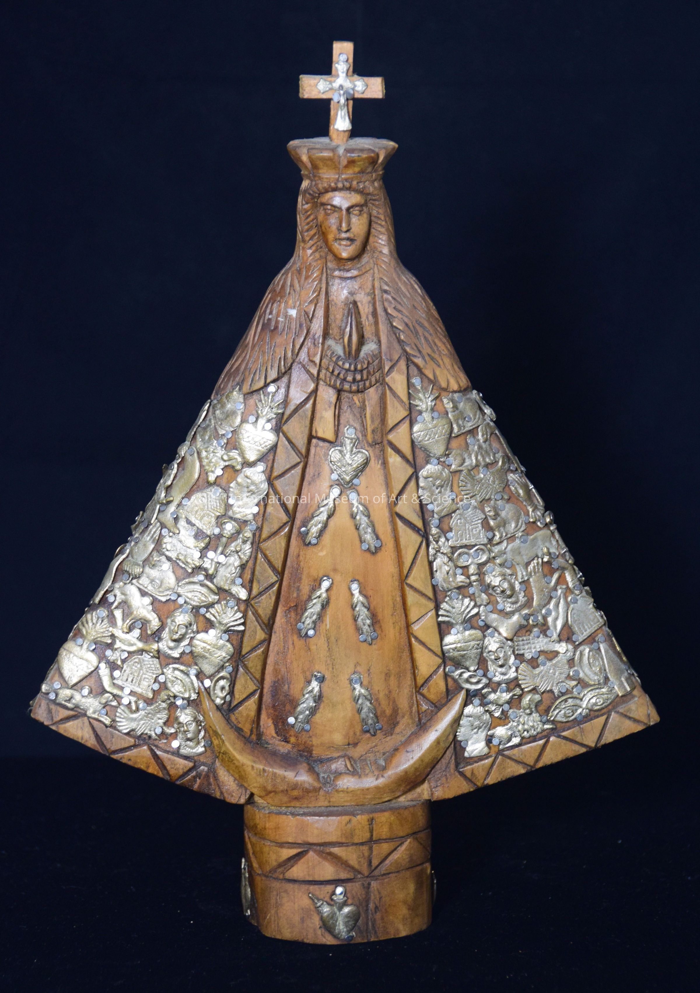 A wood carved figure of the Virgin Mary. The wooden figure is decorated with metal milagros.