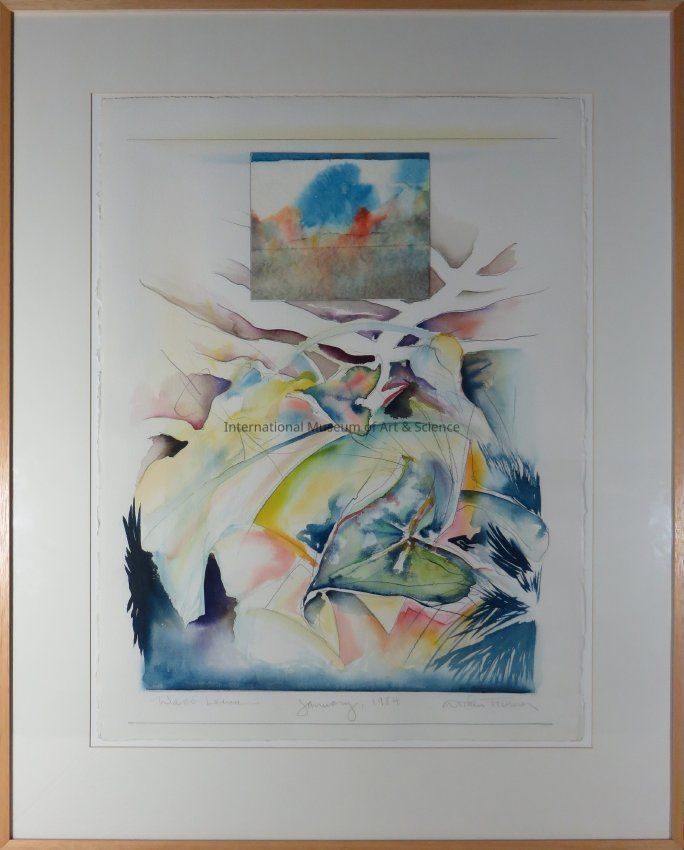 "Waco Leaves." Transparent hues of purple, green, blue, yellow, in composition of leaves and other abstracted organic forms. 7" x 8 1/4" rectangle applied and centered 2 1/2" below top edge. Intermixing, bleeding of same hues as outer composition within this inset. Framed with deckled edge of paper exposed, white mat. Light-toned hardwood frame; under plexiglas.Dimensions