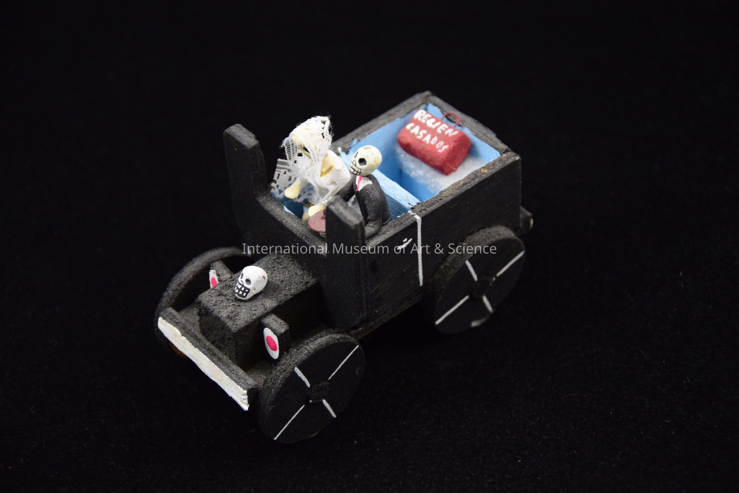 Wedding Vehicle. Day of the Dead figures; black truck with no top cover; skeletal bride in white and groom in black seated in front; reddish-brown suitcase vlack of truck, "RECIEN CASADOS" written on the suitcase; (meaning "just married") truck has pink and white headlights painted on; skull ornamenr center top hood; four round wheels.Artwork Details