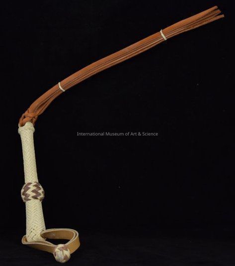 Whip. San Antonio, Jalisco. Artist Unknown. Leather, rawhide 1988. Long whip; made of natural and dyed leather. Knotted handle with spherical brown and white knot. double leather loop; neck made of white woven leather with large spherical knot of brown with white woven near the center; four light brown leather strands at the tail.Dimensions