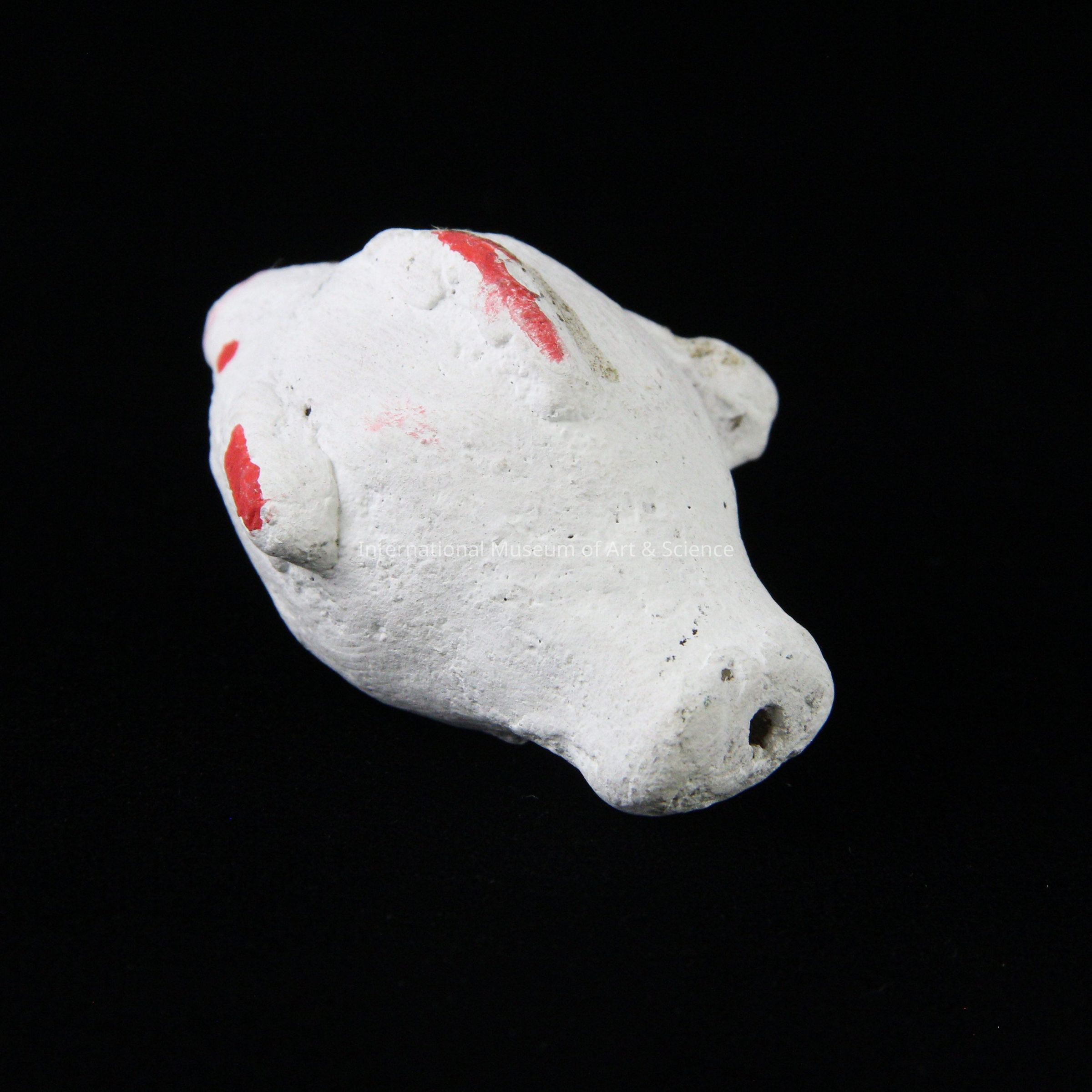 A small ceramic whistle, in the shape of a fish. The small round mouth is painted gold and red. The eyes are fins are also painted red. There are three holes, one at the mouth, one a the end of the tail, and one underneath the tail.Dimensions