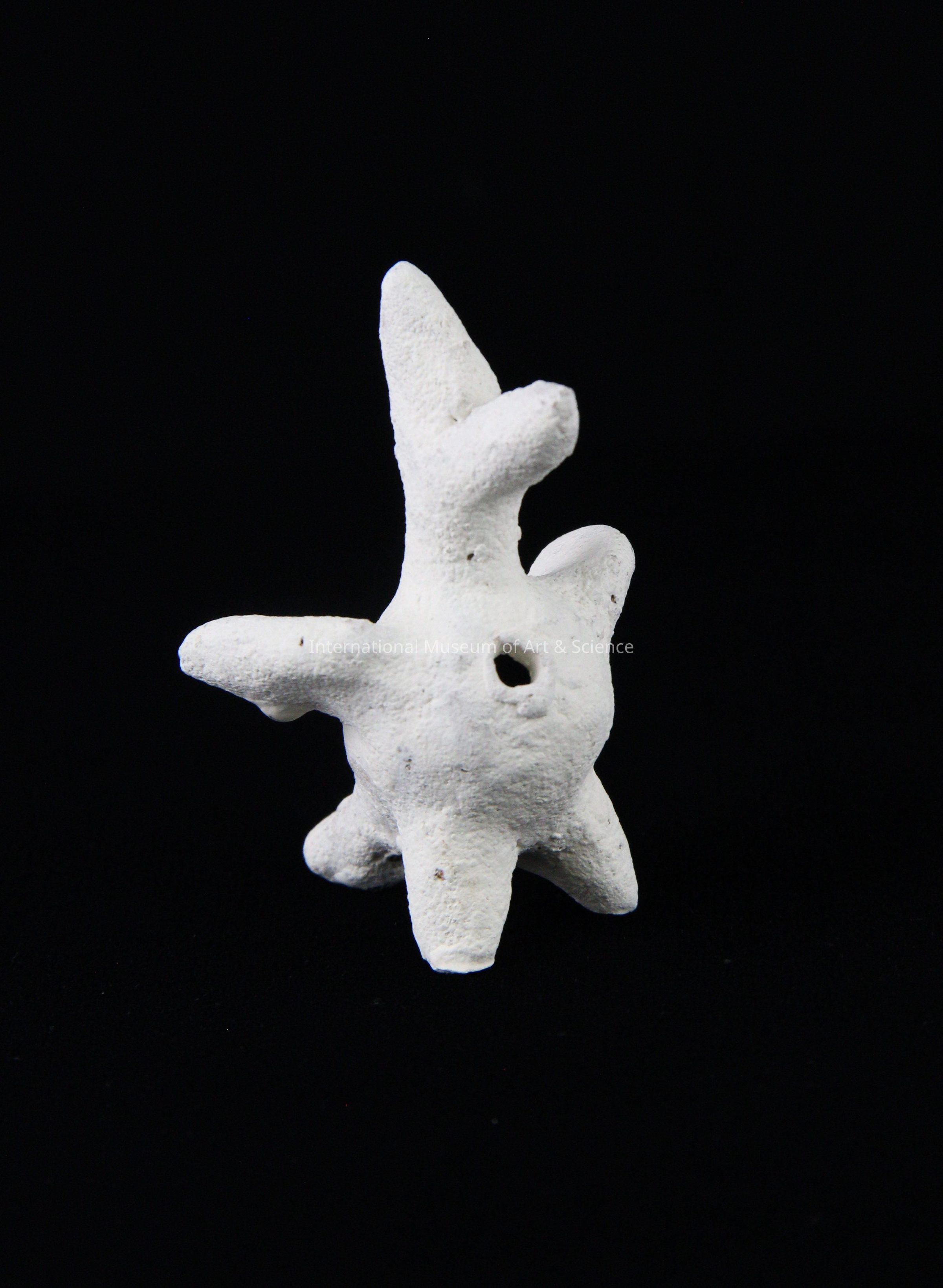 A ceramic bird whistle. The bird whistle is made of white clay. It has two short wings, a long beak, a short tail, and is standing upright with two legs and the help of its tail. There are three protruding sound holes, one at the center chest, at the tail end, and beneath the tail. It was purchased unfinished before its final painting.Artwork Details