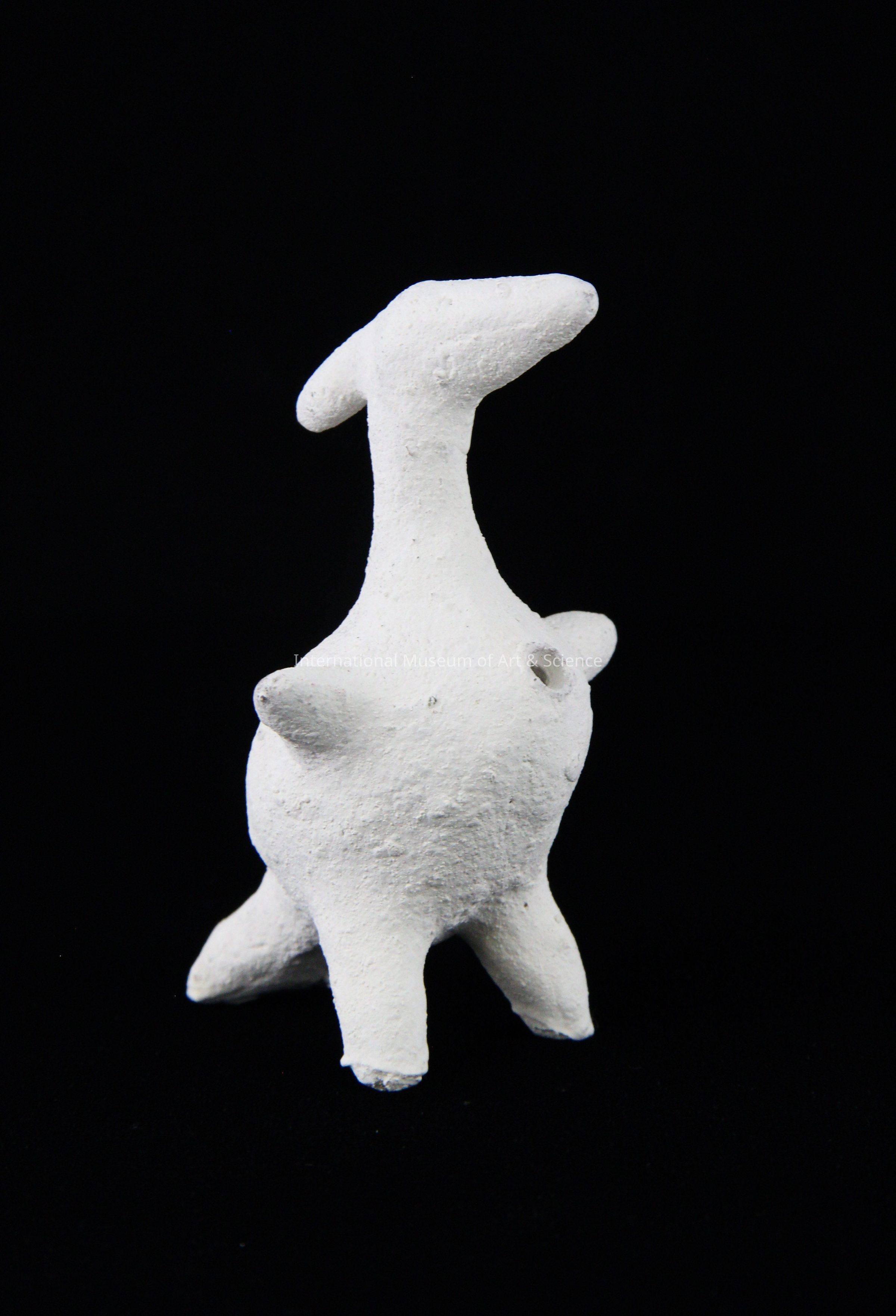 A ceramic bird whistle. The bird whistle is made of white clay. It has two short wings, a long beak, a short tail, and is standing upright with two legs and the help of its tail. There are three protruding sound holes, one at the center chest, at the tail end, and beneath the tail. It was purchased unfinished before its final painting.Artwork Details