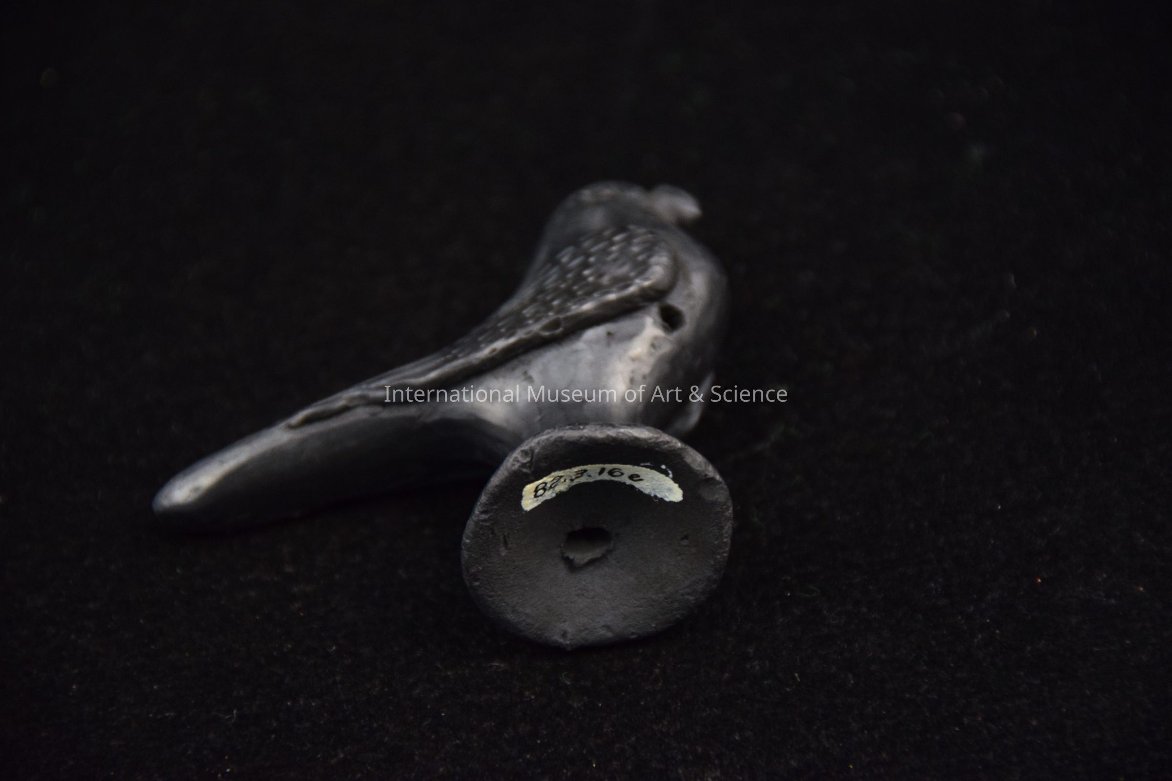 A black ceramic whistle. The ceramic whistle has a black burnished finish. The whistle is in the shape of a small bird. There is a hole on the left side of the bird and under the base to create the whistle.Dimensions