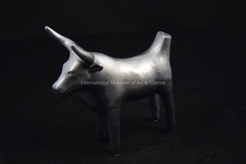 A black ceramic whistle. The whistle is in the shape of a bull. The bull is standing on all fours and has large horns. There are holes in the tail, on the side, and in the rear of the bull to create the whistle instrument.