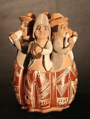 A ceramic whistle. The is circular in shape, depicting six men playing instruments. There are sound holes on the neck of each figure and a mouth hole on the leg of one of the figures. The figures are decorated with hats, shirts, and patterned pants.Dimensions