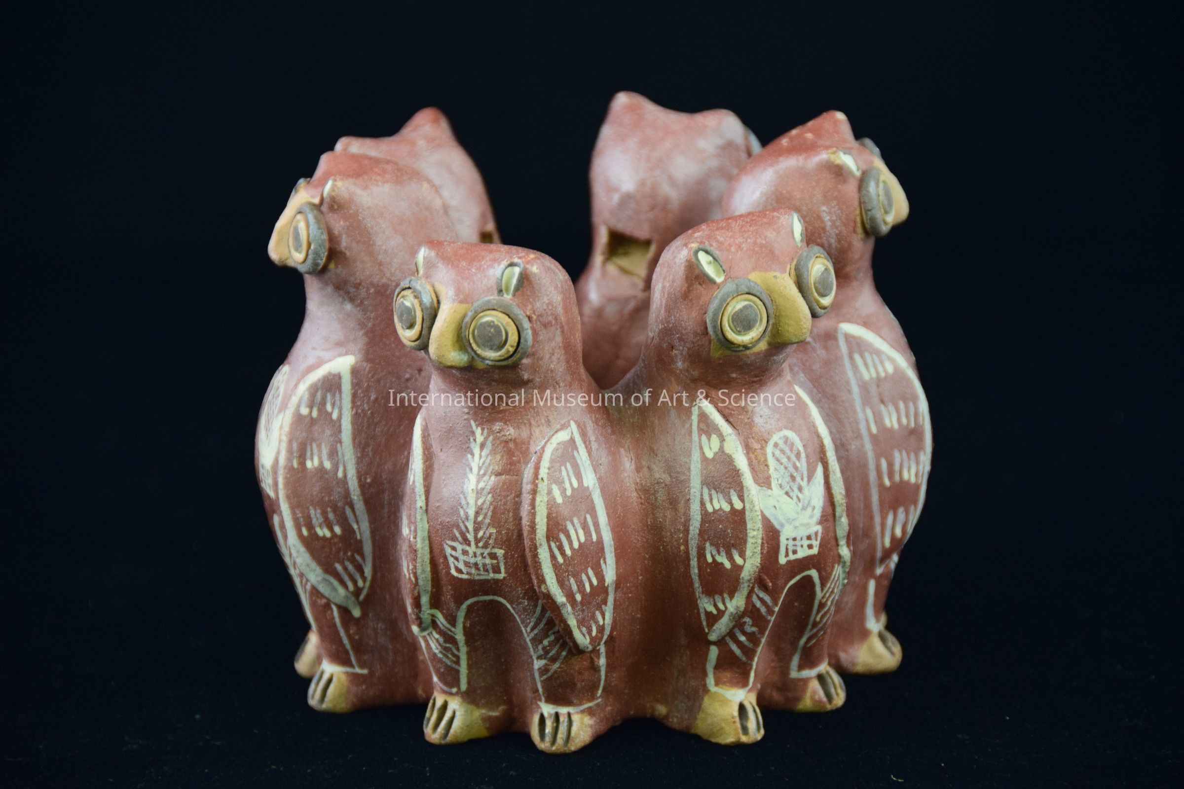 A ceramic owl whistle. There are six owls that are connected and face outward. The piece is painted with red, cream, and brown accents. There is a sound hole one the back of the neck of each owl, and a mouth hole on the front right wing of one owl.Dimensions