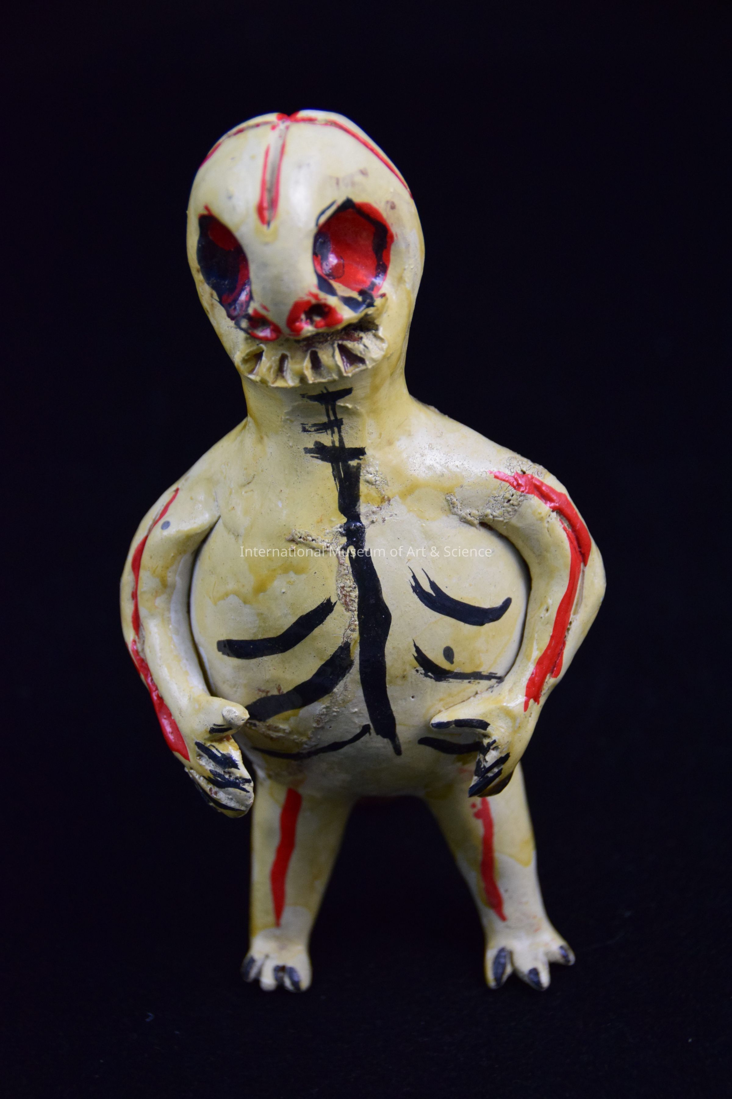 A ceramic whistle. The whistle is in the shape of a skeleton like figure. The whistle is painted white and has black and red detailing. There is an opening in the figures mouth and on the back at the base to create the whistle. This is a Day of the Dead whistle.Dimensions