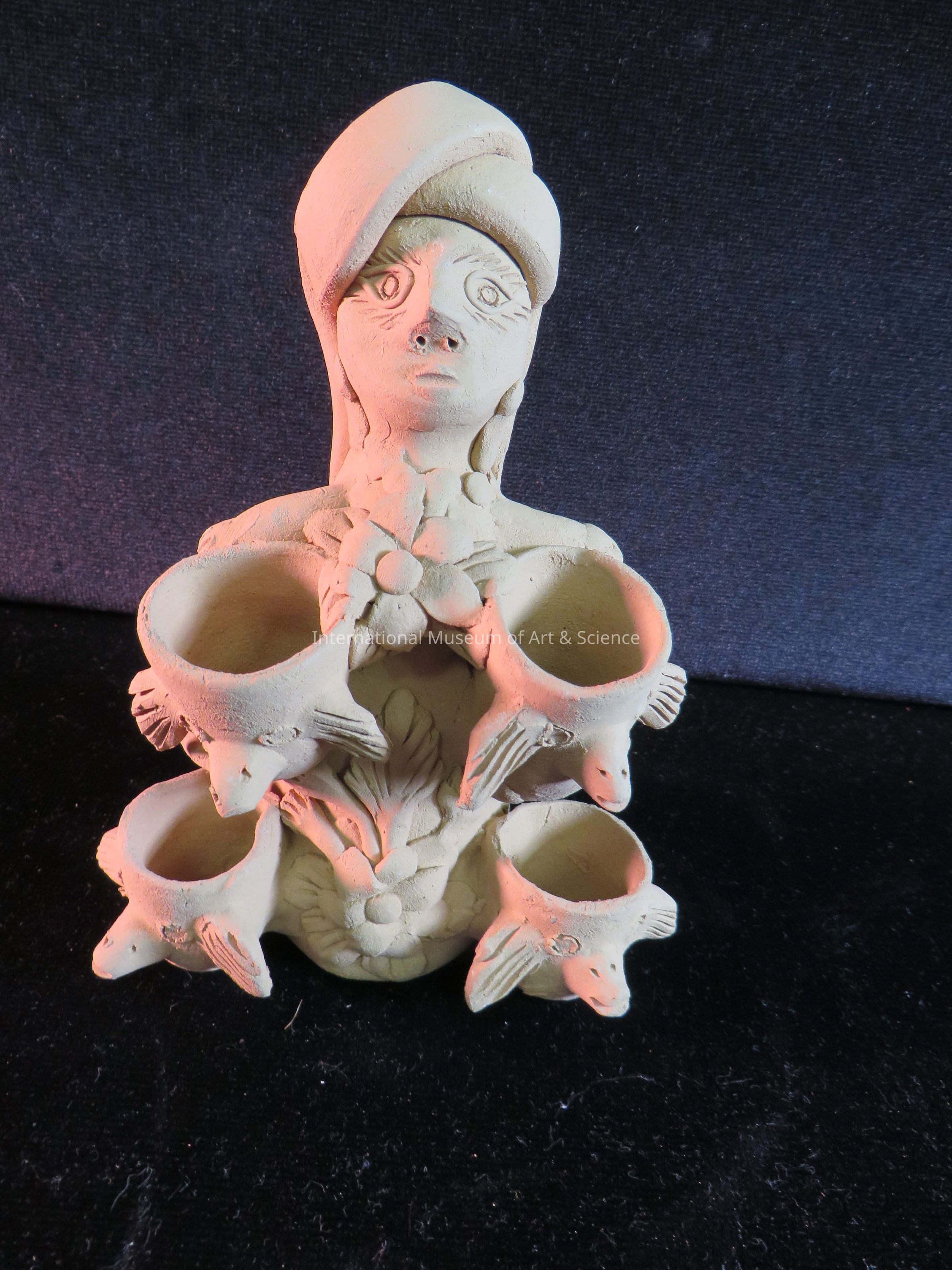 "Woman carrying Vessels". Unpainted clay; wrapped headdress; clay earrings and necklace; large floral and leaf motifs on her dress; carrying two clay vessels with animal features in relief; two other clay vessels with animal features in relief; cone-shaped skirt; carved eyes, nose, nostrils, and mouth; overall natural color of light brown.Dimensions