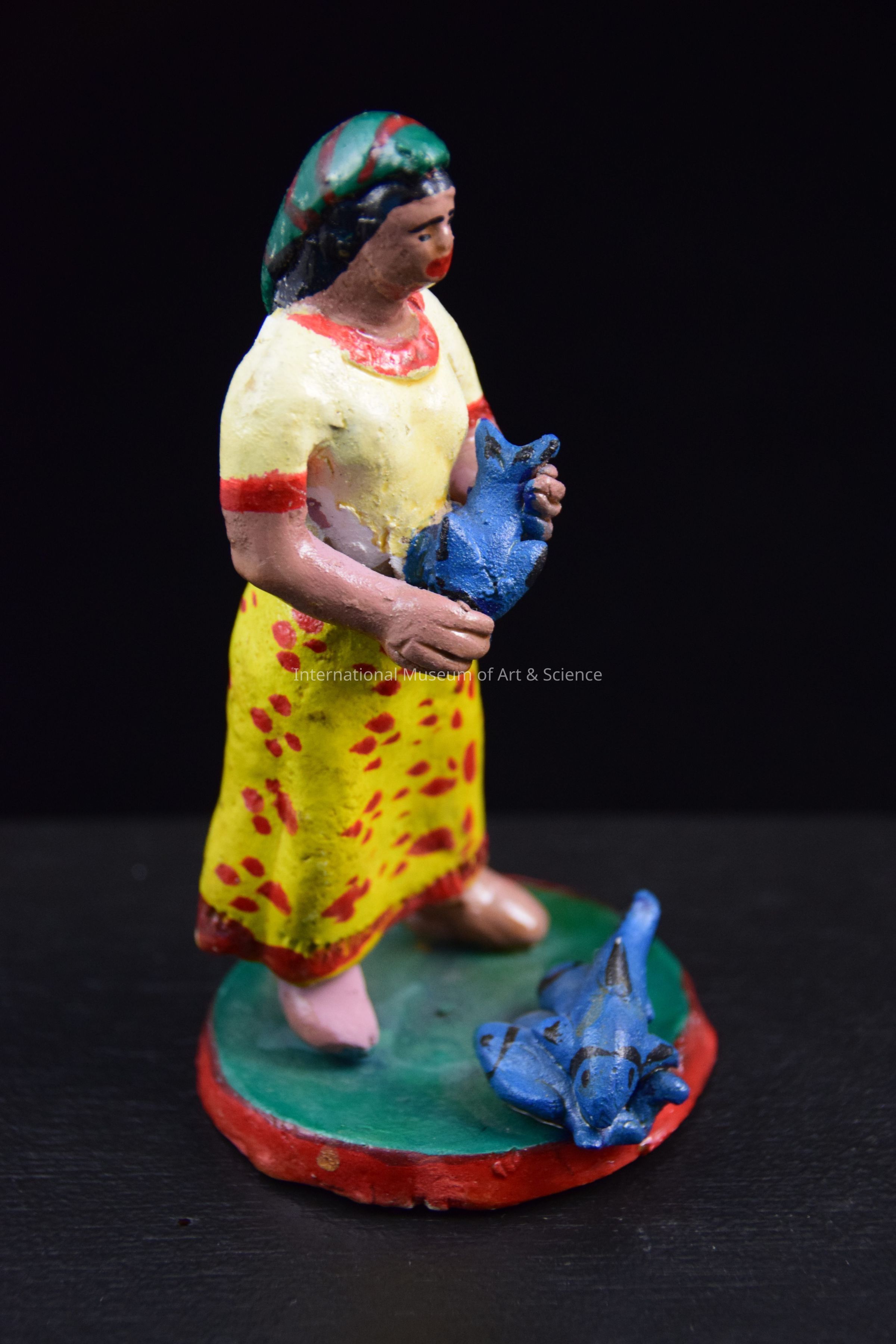 A ceramic figurine of a woman. She is standing on a green oval base. The woman is wearing a striped head cover of green with red stripes, a white blouse with red trim, and a long yellow skirt with red dot detailing. She is holding a fish in her hands and there is a pile of blue fish at her feet.Artwork Details
