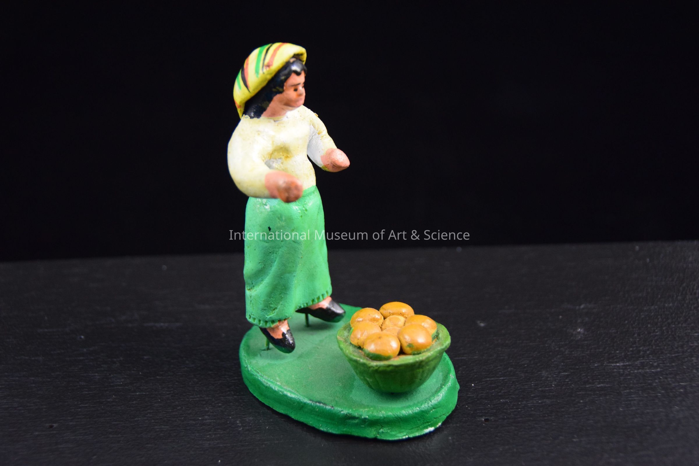 A ceramic figurine of a woman. She is standing on a green oval base. The woman is wearing a striped head cover of yellow, orange, green and black stripes, a white blouse, and a long light green skirt. She appears to be selling green basket filled with brown bread.Artwork Details