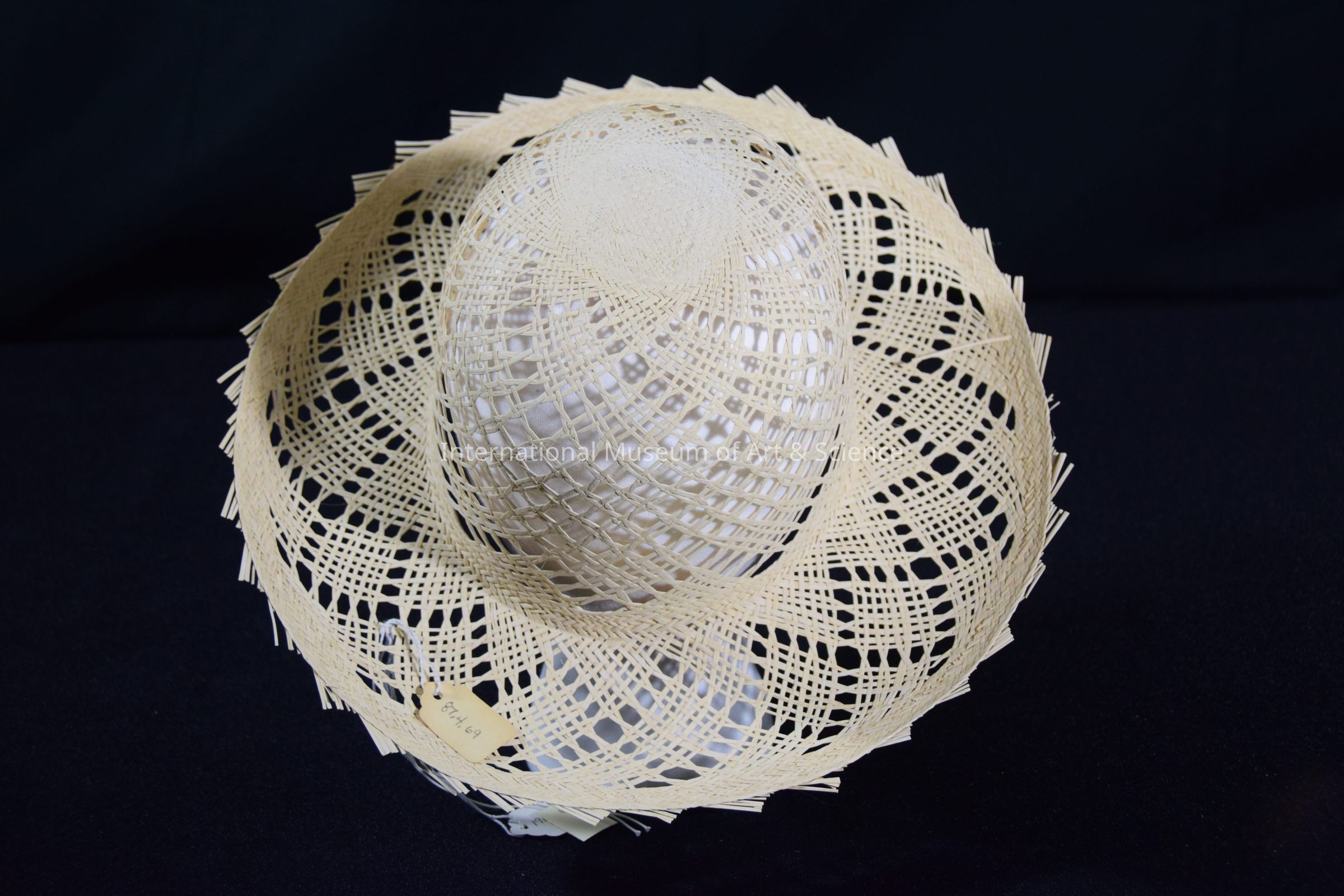 Woman's Hat. Woman's open woven hat. The brim of the hat is of an open weave of diamond shaped patterns encircling the high, convex crown of the hat. The crown of the hat is also of an open weave except at the top of the crown which is very closely woven in a star-shaped pattern. The brim edges are unfinished, giving the brim a "serrate" appearance.Dimensions