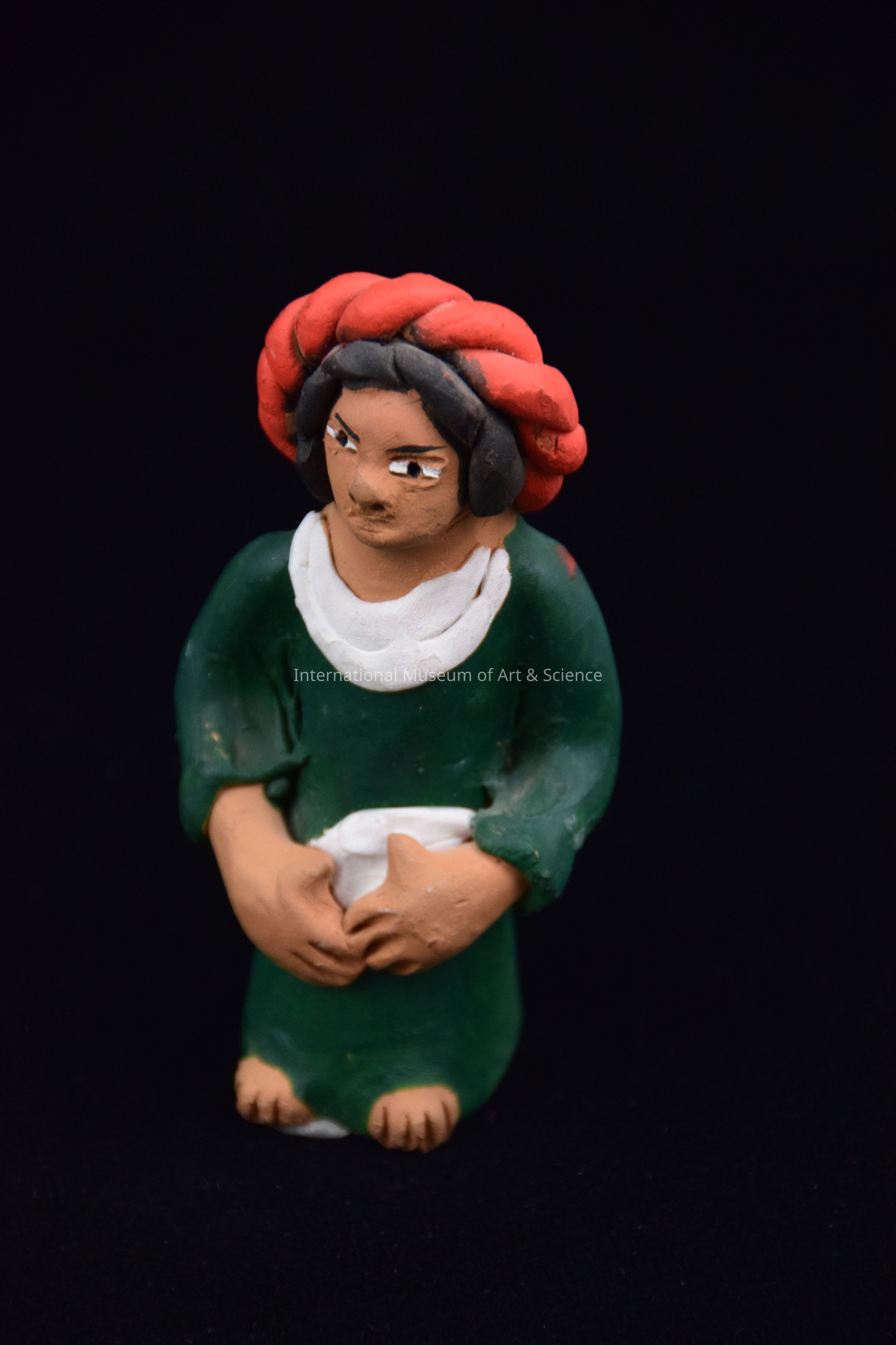 A ceramic figurine of a Mixistla (Mixistlan, Oaxaca) woman wearing dark green dress with round white neck scarf and red rodete over black hair. Women Market Figures.