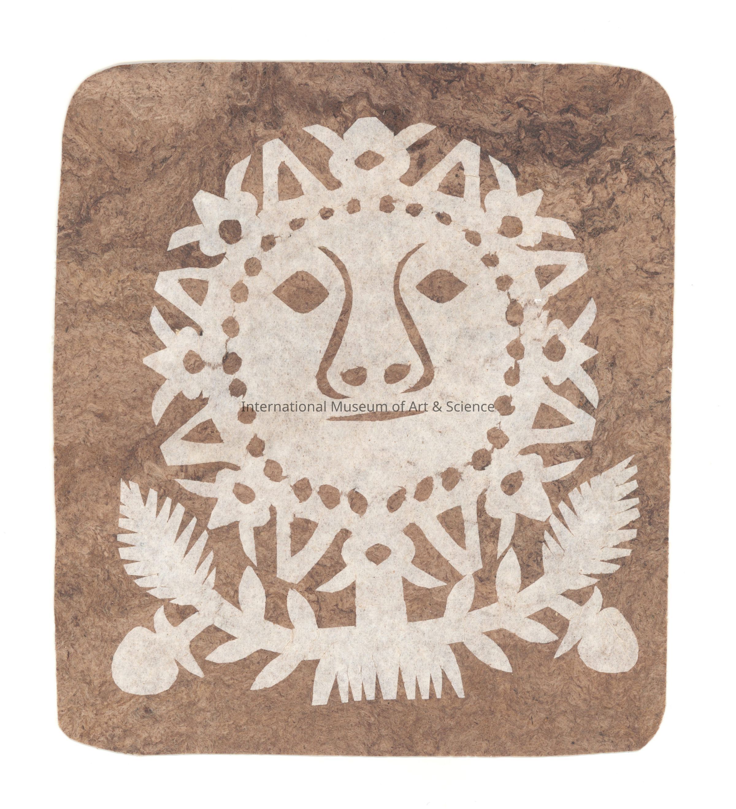 Paper cut-outs. Otomi. Amate (bark paper). Designs cut from white amate, applied to dark regular ground amate. Figure and fruit.Dimensions