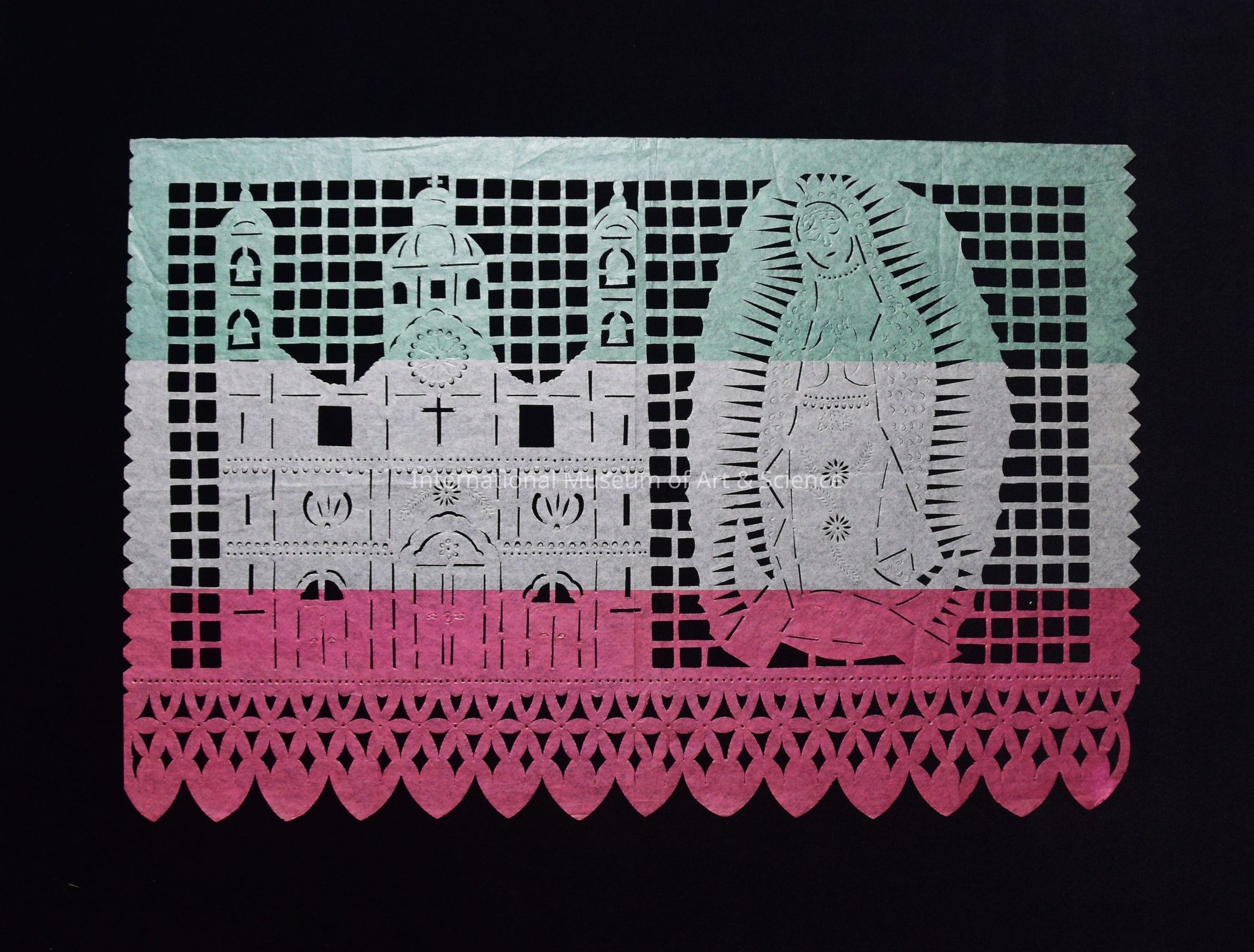 Paper Cut-Out. Rectangular paper of three horizontal bands of green/white/red. Depicts the Madonna by cathedral with bell towers. Scalloped edge on three sides.Dimensions