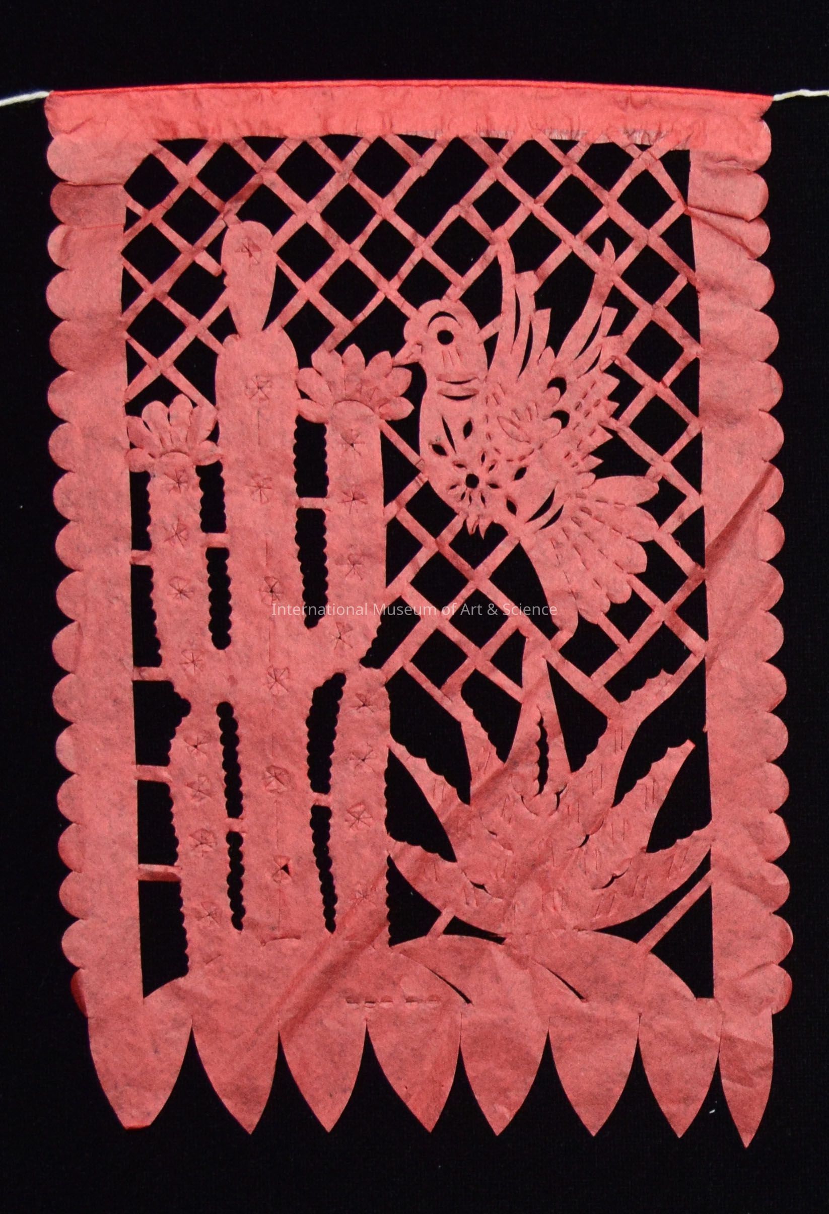 A papel picado banner. The banner is made up of ten press cut pieces of tissue paper. The imagery repeats throughout with bird, sun, and floral motifs.Artwork Details