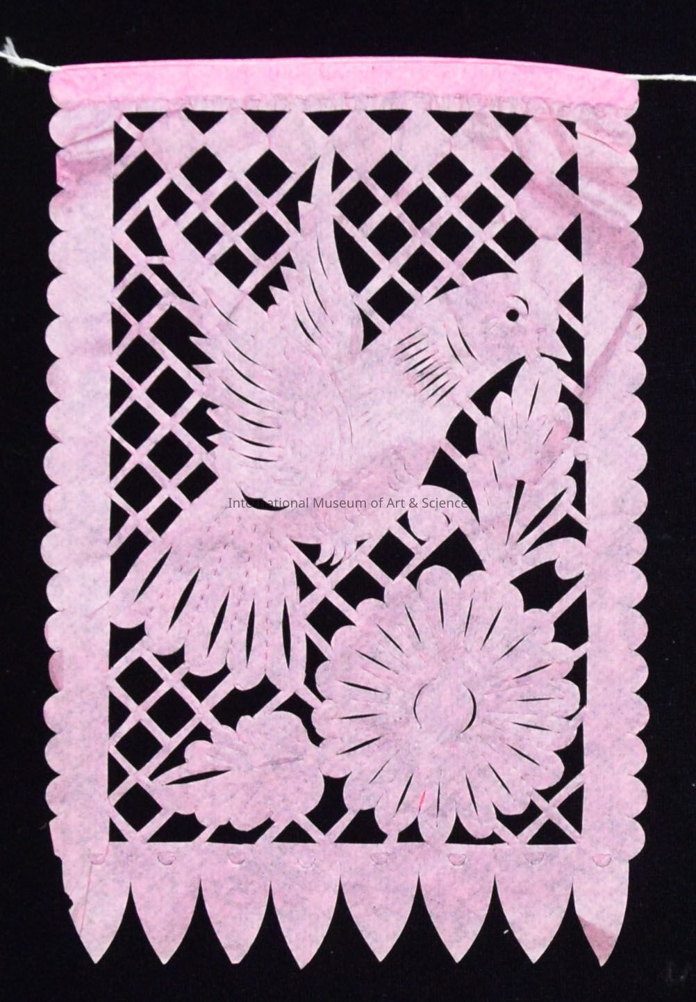 A papel picado banner. The banner is made up of ten press cut pieces of tissue paper. The imagery repeats throughout with bird, sun, and floral motifs.Artwork Details