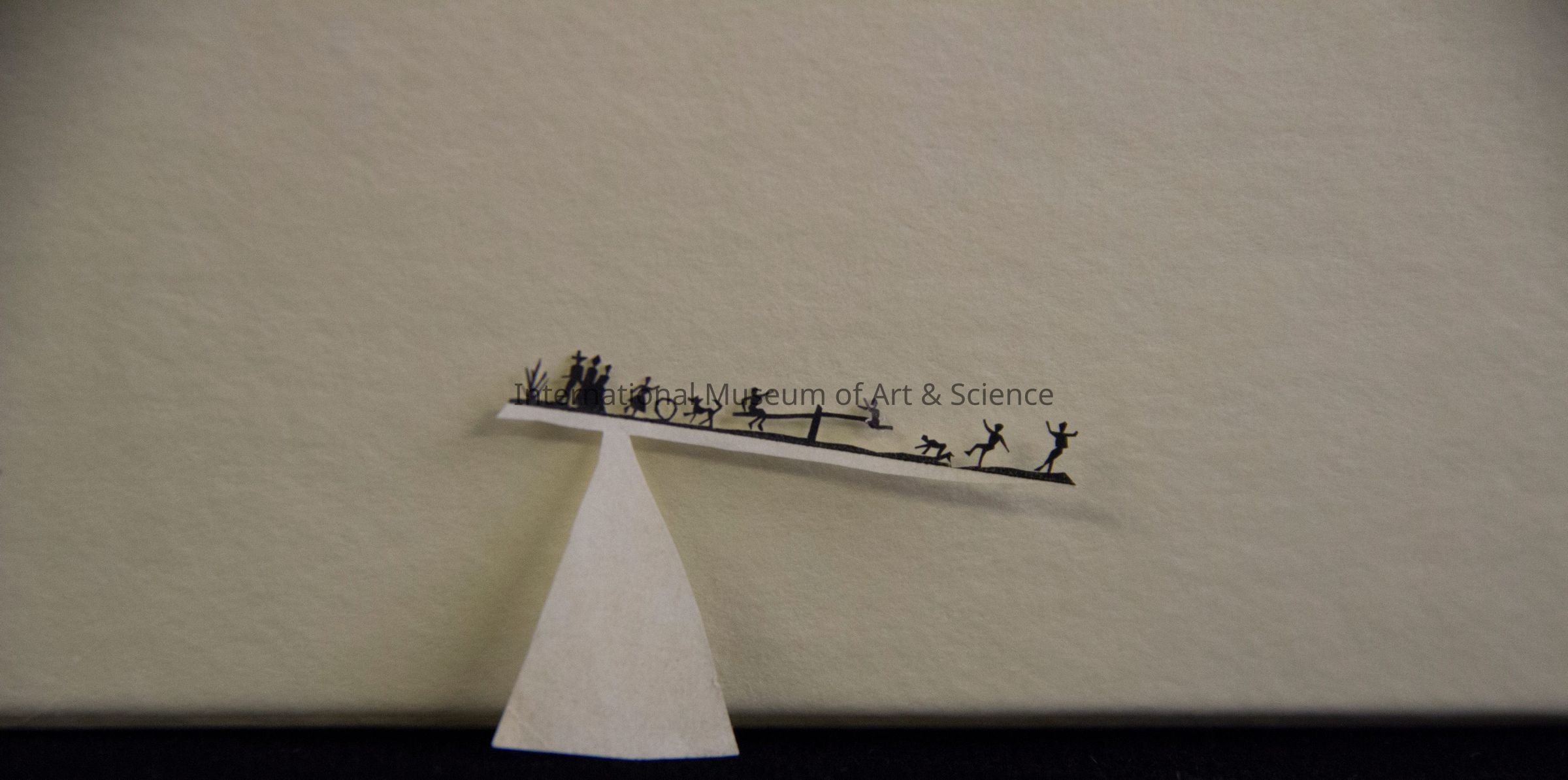 A miniature paper cut-out. The triangular base supports a horizontal bar that depicts a park scene. In silhouette form, one can see a playground scenery, plants, a girl playing with a hoop, a dog, two figures on a see-saw, and two other figures exercising or dancing.