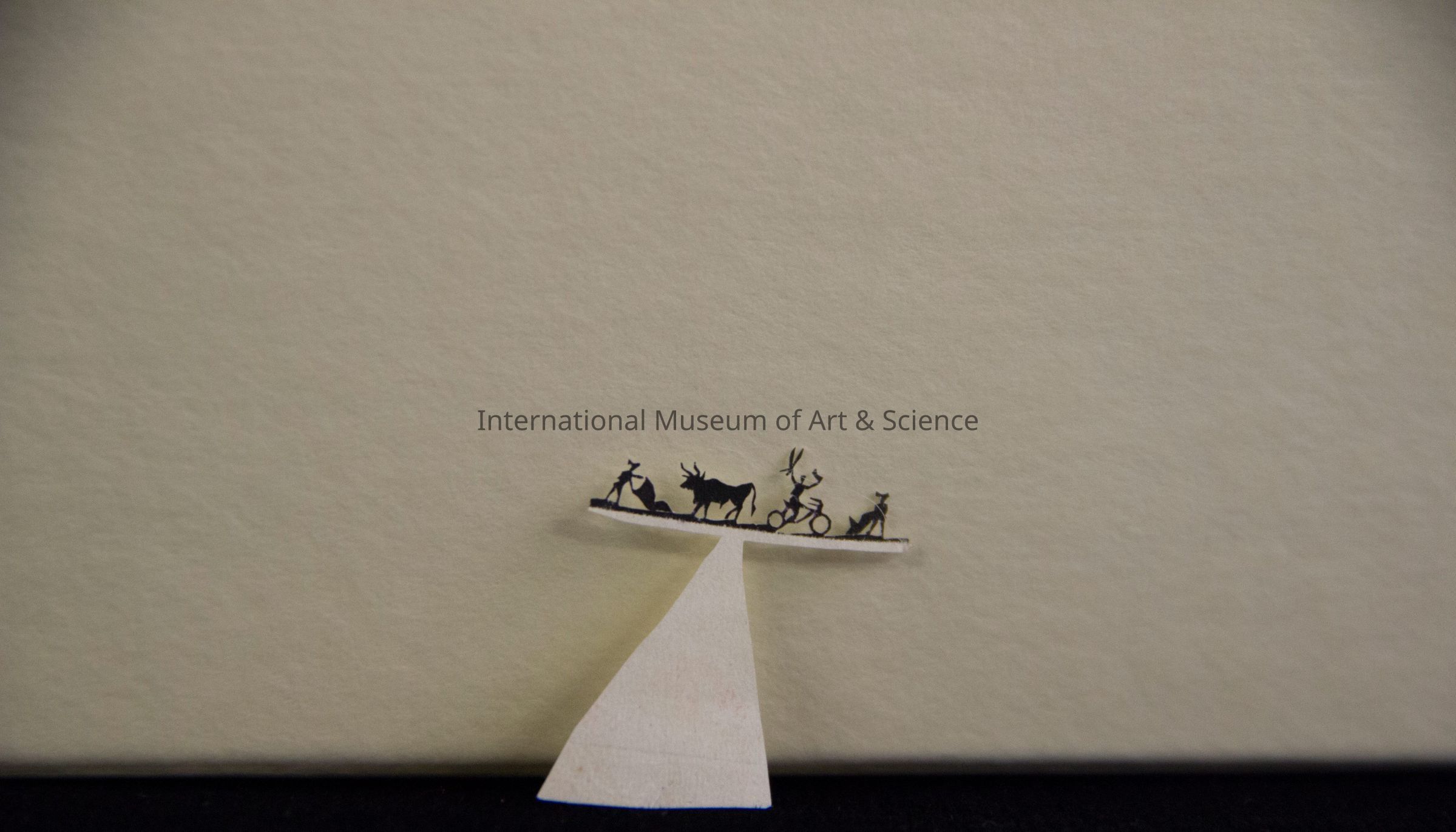 A miniature paper cut-out. The triangular base supports a horizontal bar that depicts a scene. In silhouette form, one can see a bull tamer waving his cape before a bull, a figure on a bicycle carrying objects in his hands, and another figure with a cape is behind.Dimensions