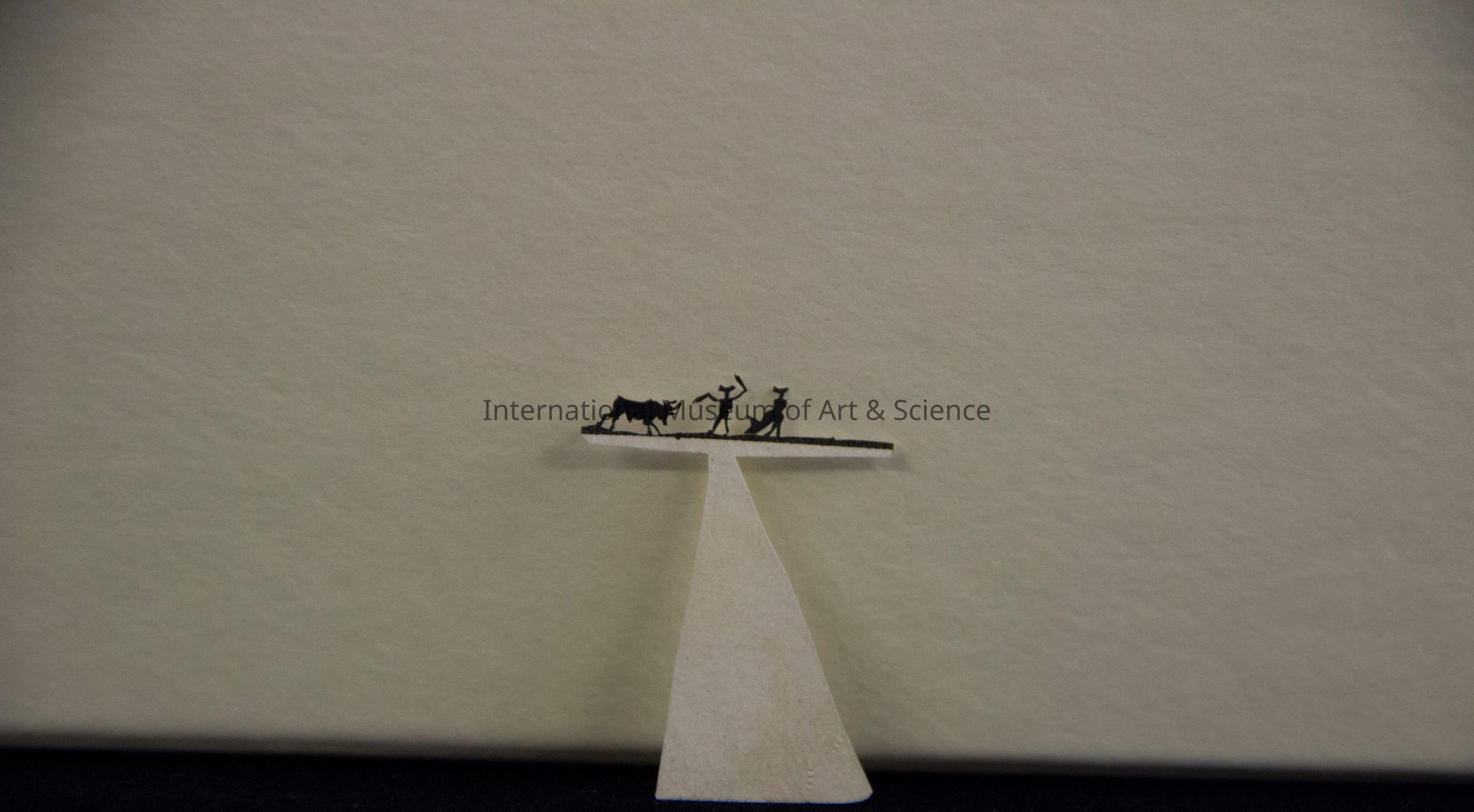 A miniature paper cut-out. The triangular base supports a horizontal bar that depicts a bull fight scene. In silhouette form, one can see a charging bull facing a picador with swords, another matador figure has his cape down, and the last figure is missing.