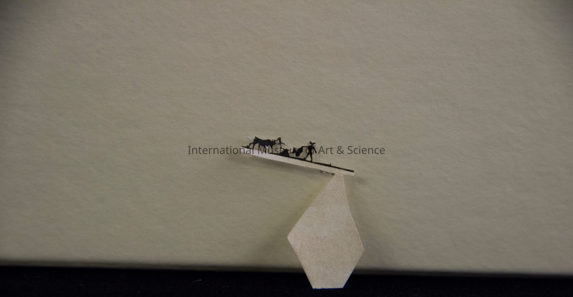 A miniature paper cut-out. The polygonal base supports a horizontal bar that depicts a bull fight scene. In silhouette form, one can see a bull goring a matador on a platform, behind the platform another matador waves his cape.Dimensions