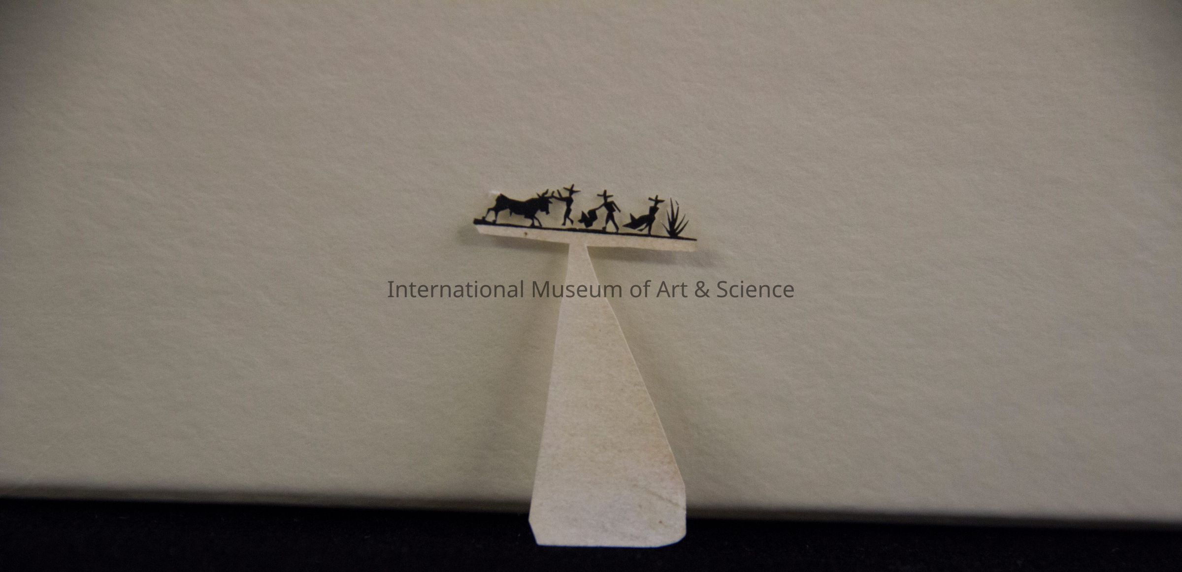 A miniature paper cut-out. The polygonal base supports a horizontal bar that depicts a bull fight scene. In silhouette form, one can see a bull goring at a figure, a cape lying on the ground, two matadores waving cape before the bull.