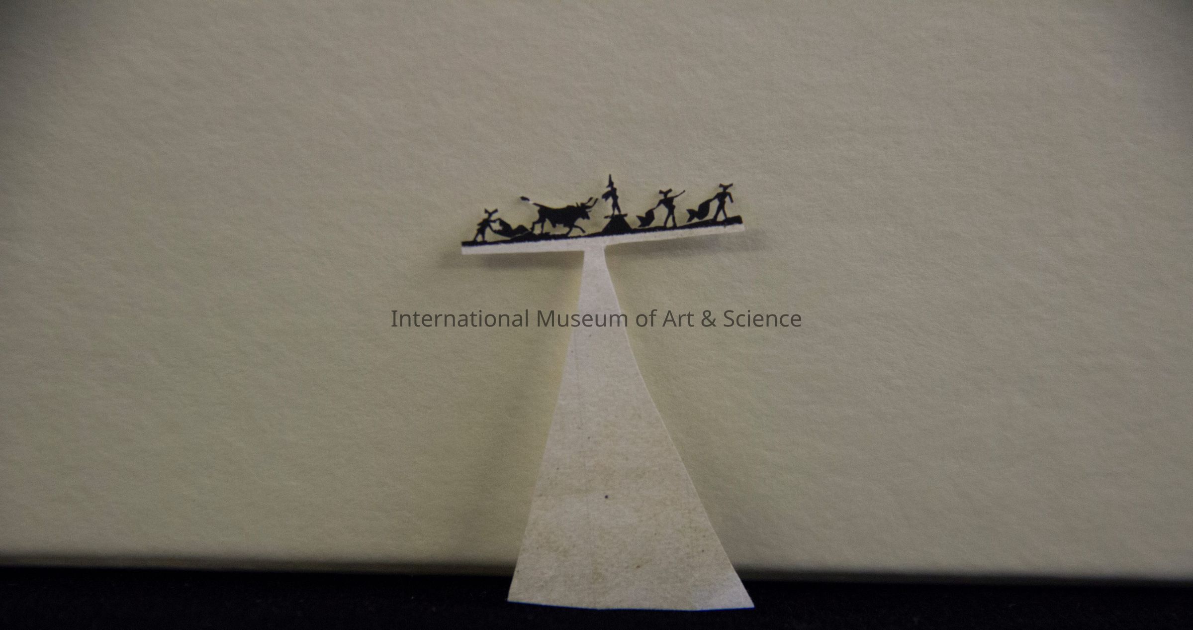 A miniature paper cut-out. The triangular base supports a horizontal bar that depicts a bull fight scene. In silhouette form, one can see a bull fighter with cape is chasing after bull, a picador on a platform, and two other picadores waving at bull as a distraction.